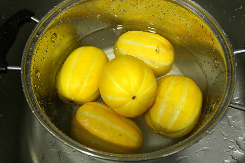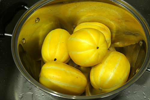 먼저 참외 세척을 진행하는데요. 냄비나 플라스틱 케이스 등에 참외를 넣습니다.