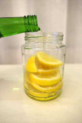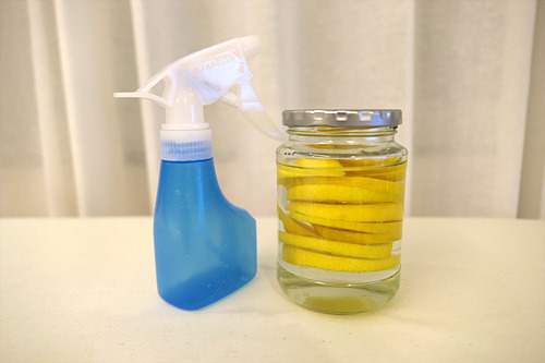 레몬을 자른 후 유리병에 넣고, 소주를 부어 냉장고에 2~3일간 숙성시킵니다. 그러면 간단하게 천연 살균제가 완성되는데요. 분무기에 담아서 청소에 활용하면 편리합니다.