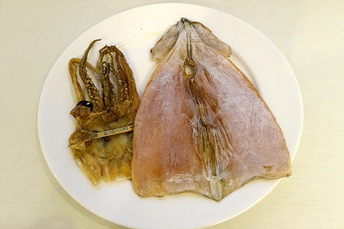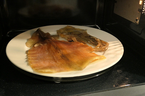 몸통에 칼집을 낸 마른오징어를 찬물에 10분 정도 담궈서 불립니다. 그리고 전자레인지에 넣고, 1분 정도만 돌리면 촉촉하게 살짝 구워진 오징어를 즐길 수 있습니다.