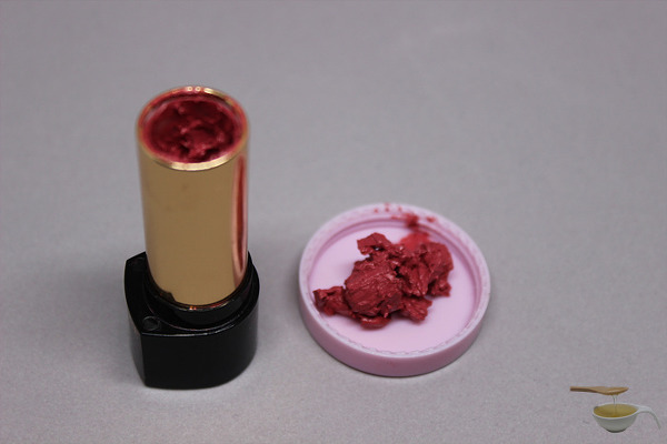 크기가 작은 스푼이나 스틱 등을 이용해서 립스틱의 끝부분을 긁어서 파냅니다. 그러면 위의 사진처럼 립밤을 만들기 충분한 양의 립스틱을 확보할 수 있는데요.