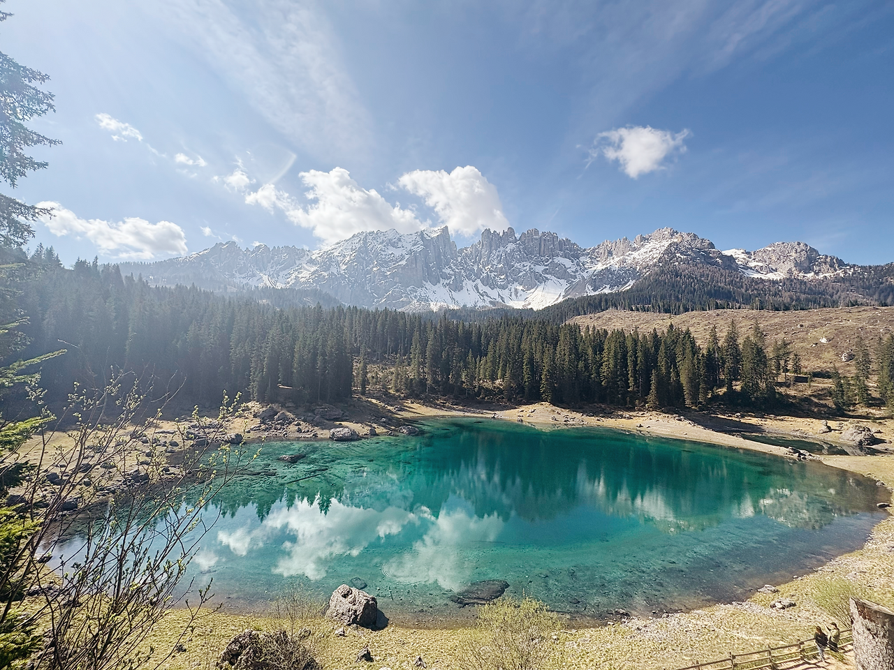 볼차노에서 버스 타고 50분 정도 가면 호수 바로 앞에 내려준다. 버스는 꽤 높이까지 올라가서 가면서 돌로미티 풍경도 볼 수 있다. 호수 앞에 도착하면 절로 탄성이 나온다. 폴란드의 모로스키에 오코에서 이제 호수 풍경은 끝판왕을 봤다고 생각했는데, 여기 호수 풍경도 장난이 아니었다. 호수 자체는 작지만 물색이 완전 에메랄드 빛이고 뒤에는 설산이 병풍처럼 둘러쌓고 있어 아주 아름다웠다. 호수를 한 바퀴 돌면서 풍경을 감상할 수 있다. 천천히 돌아도 한 시간도 걸리지 않는 크기다. 따뜻한 햇살을 맞으며 점심으로 싸간 케밥을 먹으며 풍경을 감상했다.
