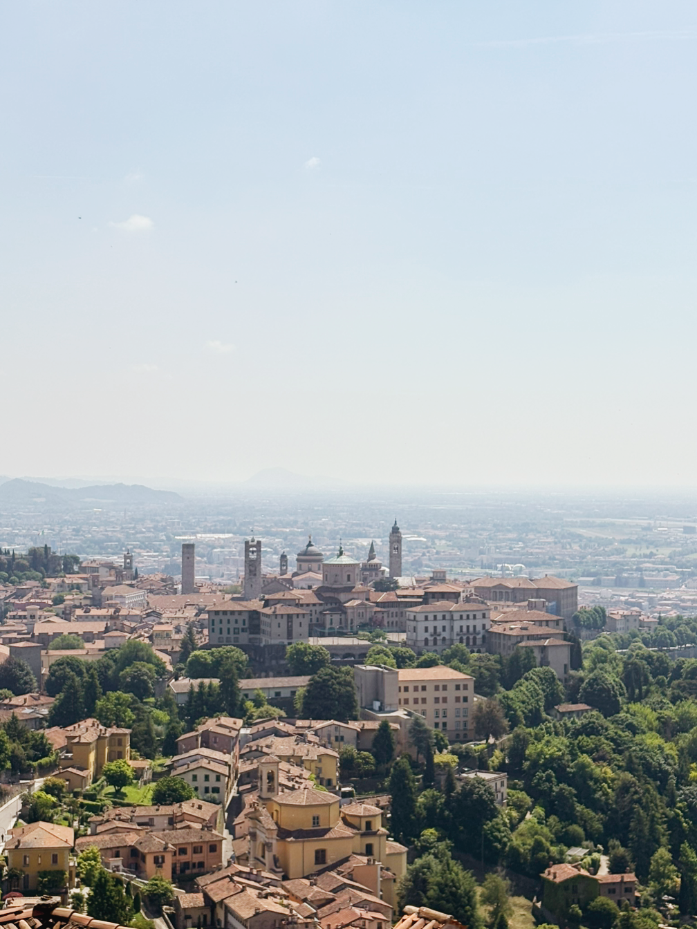 밀라노에서 1시간 좀 안 되는 거리에 베르가모가 있다. 이탈리아 소도시 느낌은 충분히 본 터라 베르가모도 큰 기대는 없이 갔다. 베르가모 기차역에 내렸는데 생각보다 베르가모는 규모가 있는 도시였다. 구도심은 걸어서는 너무 멀고 언덕에 있어 대중교통을 이용해야 한다. 대중교통 티켓 1회권은 75분 동안 버스, 트램, 푸니쿨라 등등 모든 베르가모 대중교통을 이용할 수 있다. 버스를 타고 구도심에 있는 베키아 중앙 광장에 갔다. 중앙 광장에는 콜로오니 예배당, 시청탑, 대성당 등 여러 볼거리가 몰려있다. 대충 후다닥 보고 나서 베르가모 시내를 한눈에 볼 수 있는 산 비질리오 전망대 쪽으로 푸니쿨라를 타고 갔다. 사실 구도심만 가도 꽤 언덕이라 도심이 한눈에 보인다. 그런데 한번 더 올라가니 탁 틔인 풍경이 가슴을 뻥 뚫리게 한다. 헝가리의 에스테르곰에서 본 풍경이 생각나는데 이곳은 좀 더 컸다.