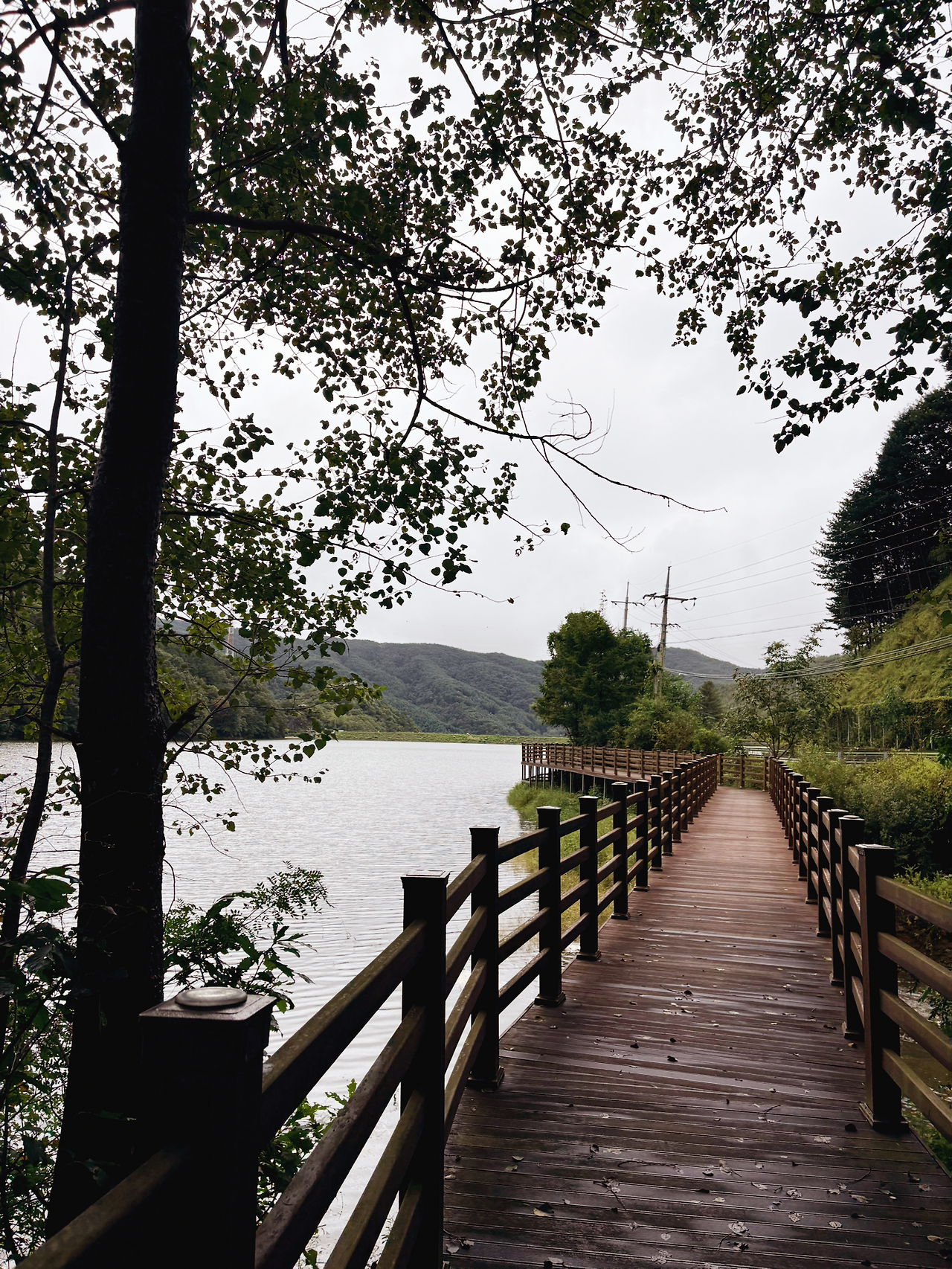홍천에 좋은 경치와 함께 가볍게 산책할 수 있는 숨은 공간이 있다고 해서 찾아가 보았다. 저수지 주변에는 데크 길이 잘 깔려 있어 편하게 걸을 수 있었다. 비가 많이 내린 다음 날이라 바닥에 나뭇잎과 나뭇가지가 어지럽게 떨어져 있긴 했지만, 산책하는 사람이 거의 없어 아주 조용히 걸을 수 있는 매력이 있었다.