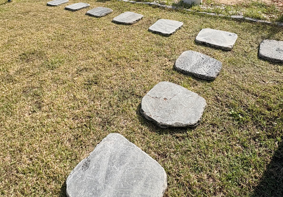 마당의 잔디는 한없이 관심을 많이 줘야 한다. 텃밭이나 바비큐존을 오가다 보니, 그 길목의 잔디가 밟혀서 점점 죽어가고 있었다. 그래서 지나가는 길 위로 판석을 두어 잔디를 보호하기로 했다.