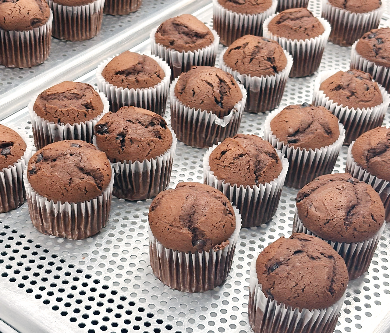 초코 머핀은 비중은 제지 않고 반죽 온도만 잰다. 짤 주머니를 이용해 팬닝 하는데 처음엔 전체 컵의 60% 정도만 채우고 나서 나머지 반죽으로 나눠서 동일한 크기가 될 수 있도록 팬닝 한다. 머핀류는 제과 기능사 품목 중에 조금 쉬운 제품에 속하는데, 그래서 오히려 더 어렵다는 이야기도 많다. 그래서 머핀류는 팬닝 양이 일정하게 하는 게 정말 중요하다. 24개 머핀 반죽을 동일하게 팬닝 하고, 머핀 틀은 오븐에는 가로로 들어간다.