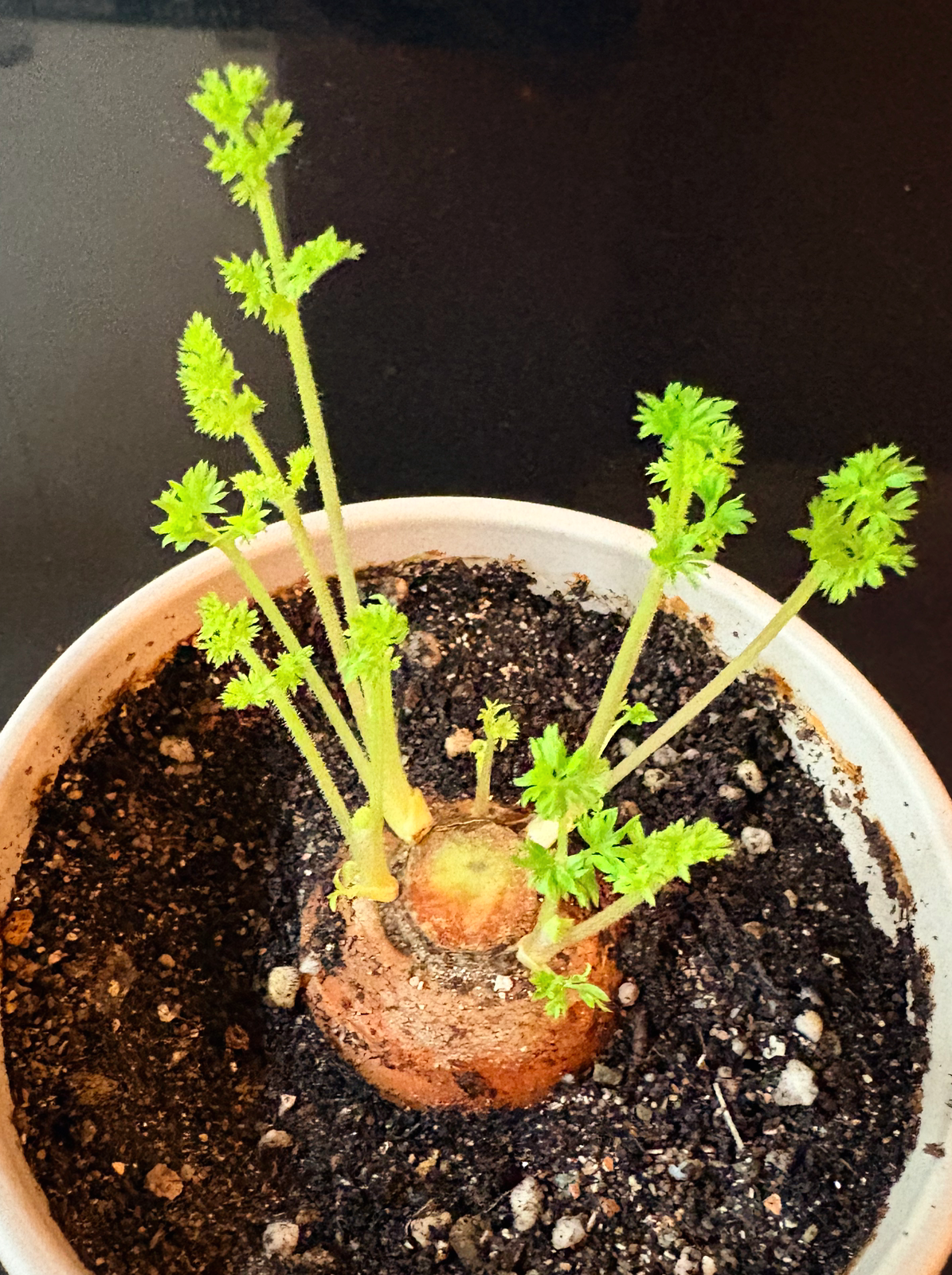 햇빛이 거의 들지 않는 곳에 두었기에, 사실 싹이 트기엔 좋지 않은 환경이었다. 그런데도 이렇게 꿋꿋하게 새싹을 틔워내는 걸 보니 정말 대단하다. 작은 당근 싹 하나에서 ‘살아 있음’이란 게 얼마나 강한 힘인지 느끼게 된다.