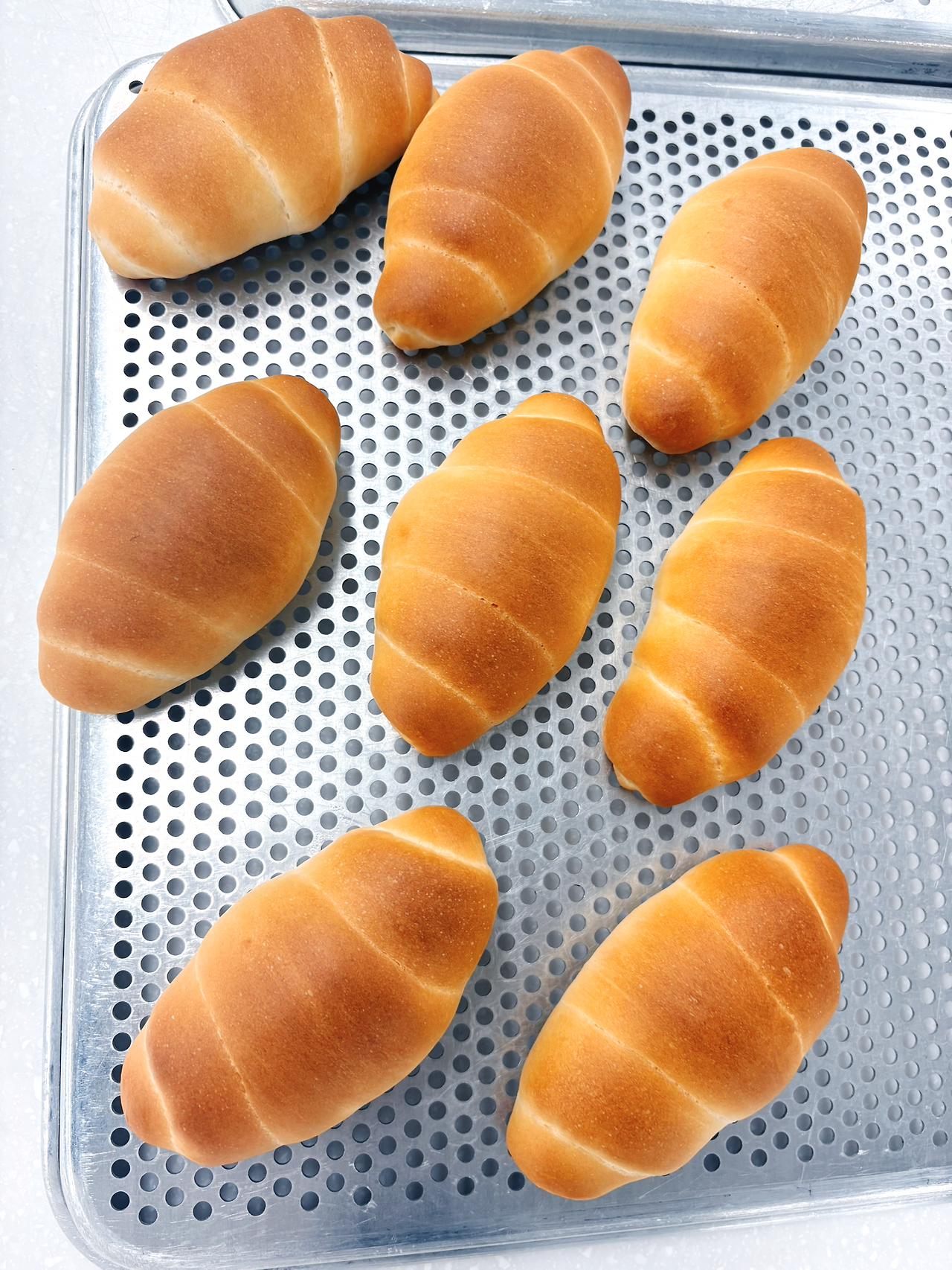 버터롤 생김새는 요즘 몇년 동안 계속 인기가 많은 소금빵하고 비슷하게 생겼다. 하지만 실기 품목인 버터롤은 그냥 안에 아무것도 들어있지 않아 소금빵 만큼 특별하지는 않다. 반죽을 긴 삼각형 모양으로 만든 다음 도로록 말아서 간격이 일정한 버터롤을 만들어야 한다. 바닥쪽에 이음매를 둬야 하는데 이음매를 제대로 꼬집지 않으면 바닥에 빼꼼하고 혓바닥처럼 밖으로 삐져 나온다. 여러개 버터롤의 전체적인 크기와 말린 간격이 일정해야하는데 역시 쉽지 않다. 2차 발효도 충분히 해야 통통한 버터롤이 나온다.