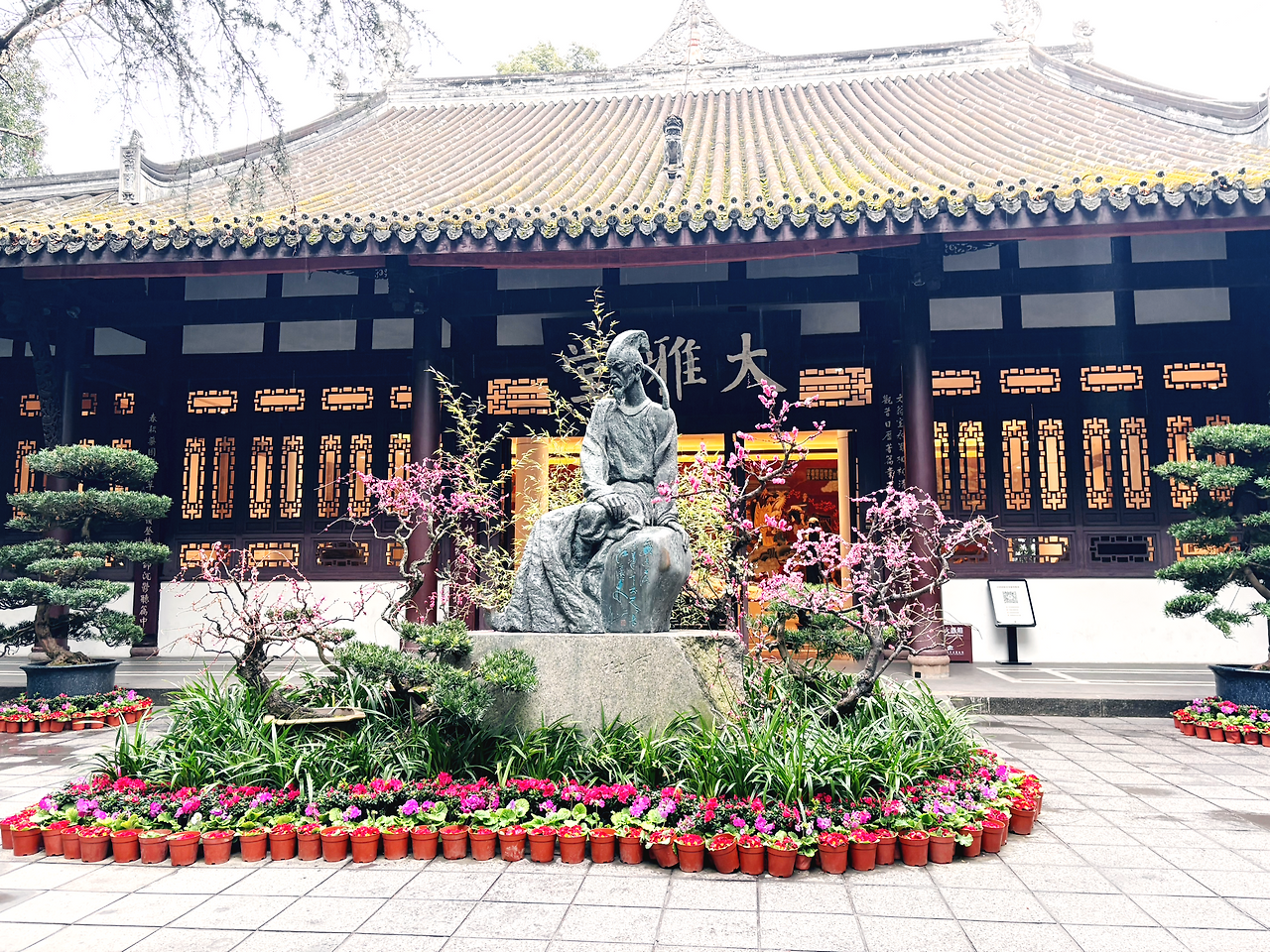 두보초당은 단순한 생가 복원지가 아니라, 시인의 삶과 정신을 기리는 문화 공간에 가깝다. 대나무 숲과 연못, 정자들이 어우러져 고즈넉한 분위기를 자아내고, 곳곳에는 두보의 시 구절이 새겨진 비석들이 세워져 있다. 초당 내부에는 그의 생애를 정리한 전시관과 시문 자료들이 마련되어 있었지만, 한자를 잘 몰라 자세한 내용을 이해하기는 어려웠다. 그렇지만 잘 가꾸어진 정원을 천천히 걷거나, 분재로 꾸며진 길을 따라 거닐다 보면 두보를 잘 모르는 사람이라도 충분히 즐길 수 있는 공간이었다.