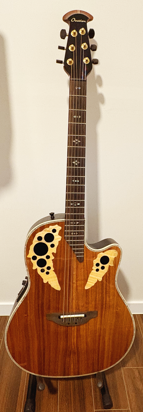 두 번째 기타는 오베이션이다. 예전엔 오베이션이 어쿠스틱을 앰프에 연결해서 사용하는 기타 이름인 줄 알았다. 오베이션은 미국 어쿠스틱 기타 제조회사 이름이다. 이 회사를 만든 사람은 헬리콥터를 제조하는 항공 엔지니어라고 한다. 기타를 수집하다가 자신이 필요한 기타를 만들었다고 한다. 오베이션 기타는 저가모델은 취급하지 않아 가격대가 있는 편이다. 이번에 홍천밴드를 준비할 때 큰맘 먹고 오베이션 기타를 샀다. 예전부터 갖고 싶었던 기타 이기도 하고 작곡할 때 도움이 많이 될 것 같아 샀다. 결론적으로 아주 좋은 선택이었다. 오베이션은 앰프에 연결하지 않아도 그 자체로 연주할 수 있어 어떤 악상이 떠오를 때 활용하면 손쉽게 연주할 수 있다. 녹음할 때는 잭으로 연결하면 깔끔하게 녹음도 되니 만능이다.