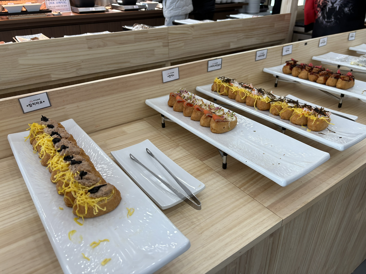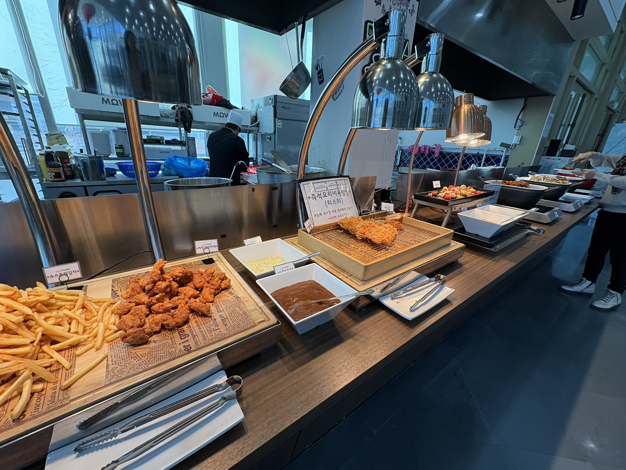 초밥, 롤, 샐러드, 돈가스, 치킨, 감자튀김, 과일, 디저트 등 웬만한 음식들을 있다. 소고기 스테이크도 무한으로 주는데 스테이크는 정말 별로였다. 이거 말고 다른 음식들은 다 먹을만하다. 짬뽕, 짜장면, 우동 같은 것도 있다. 음식 구성은 때마다 바뀐다. 양평이나 홍천 놀러 갈 때 부담 없이 들러서 먹을 수 있다. 가족이나 친구 여럿이 가는 것도 추천한다.