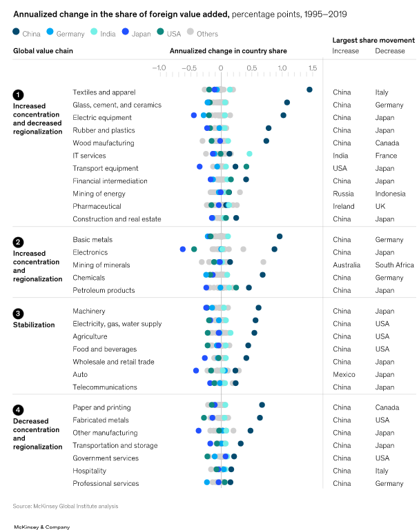 중국이 주요 산업에서 가장 점유율을 늘린 반면, 일본과 독일이 피해입어