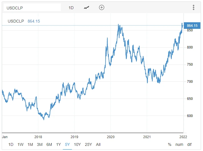 두 번째 문제는 금융시장 참가자들의 냉정한 눈길 때문. 아래 <그림>은 칠레 페소화의 미국 달러대비 환율인데, 대통령 선거 이후 환율이 2020년 코로나 팬데믹 때의 고점을 넘어선 것을 발견할 수 있음. 즉 칠레에 투자하던 글로벌 투자자들은 "이 대통령이 어떤 사람인가?"에 대해 일단 매우 시니컬한 태도를 취하고 있다는 것.
