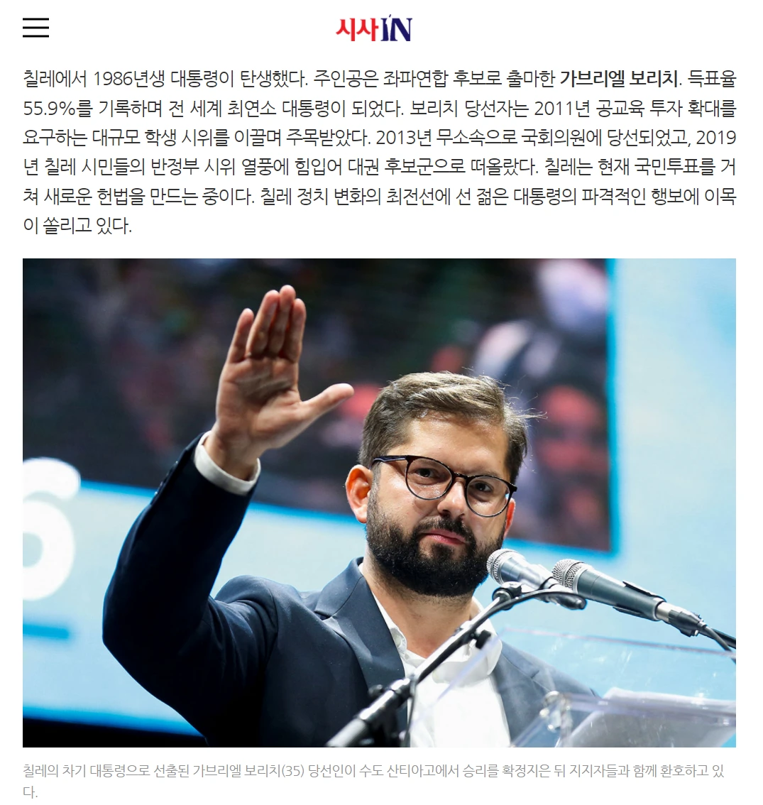 즐겨보는 시사주간지, 시사인에 아래와 같은 기사가 올라온 기념으로 간단 포스팅. 한눈에 보더라도 젊고 개혁적인 마인드로 무장한 대통령은 어떤 변화를 가져올 것인가? 피노체트 이후 '프리드먼의 아이'들에 의해 주도적으로 시장 친화적 개혁을 추진했던 나라. 칠레의 경제구조가 바뀔수 있을 것인가?