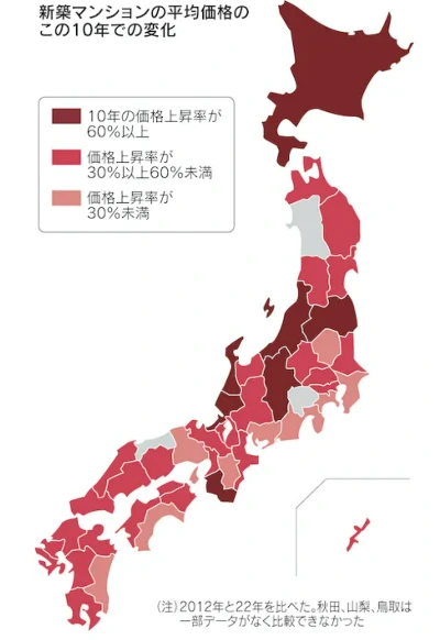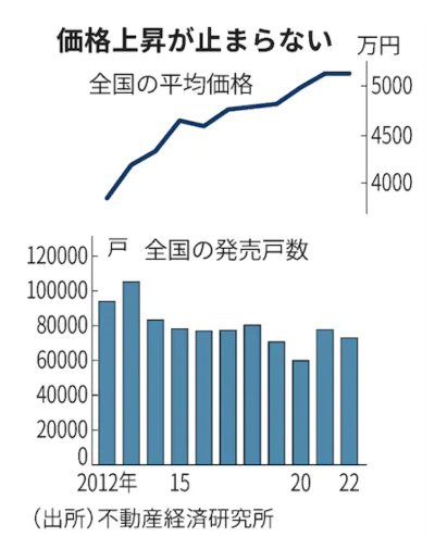 지구와 도시별로 보면 도쿄 23구는 2012년과 비교해 8236만엔 상승한 6288만엔이었고 수도권은 38.5% 오른 2950만엔이었다.삿포로시는 5022만엔(70.9% 상승), 센다이시는 3587만엔(37.0% 상승), 나고야시는 4635만엔(3.9% 상승), 긴키권은 4455만엔(34.8% 상승), 히로시마시는 4228만엔(38.8% 상승), 후쿠오카시는 4661만엔(53.4% 상승)이었다.아파트 용지와 인건비가 급등한 데다 엔화 약세 등을 배경으로 자재 가격도 비싸다.부동산업체들은 가격을 내리지 않고 시간을 들여 판매하는 전략에 쐐기를 박고 있어 가격은 떨어질 기미가 보이지 않는다.