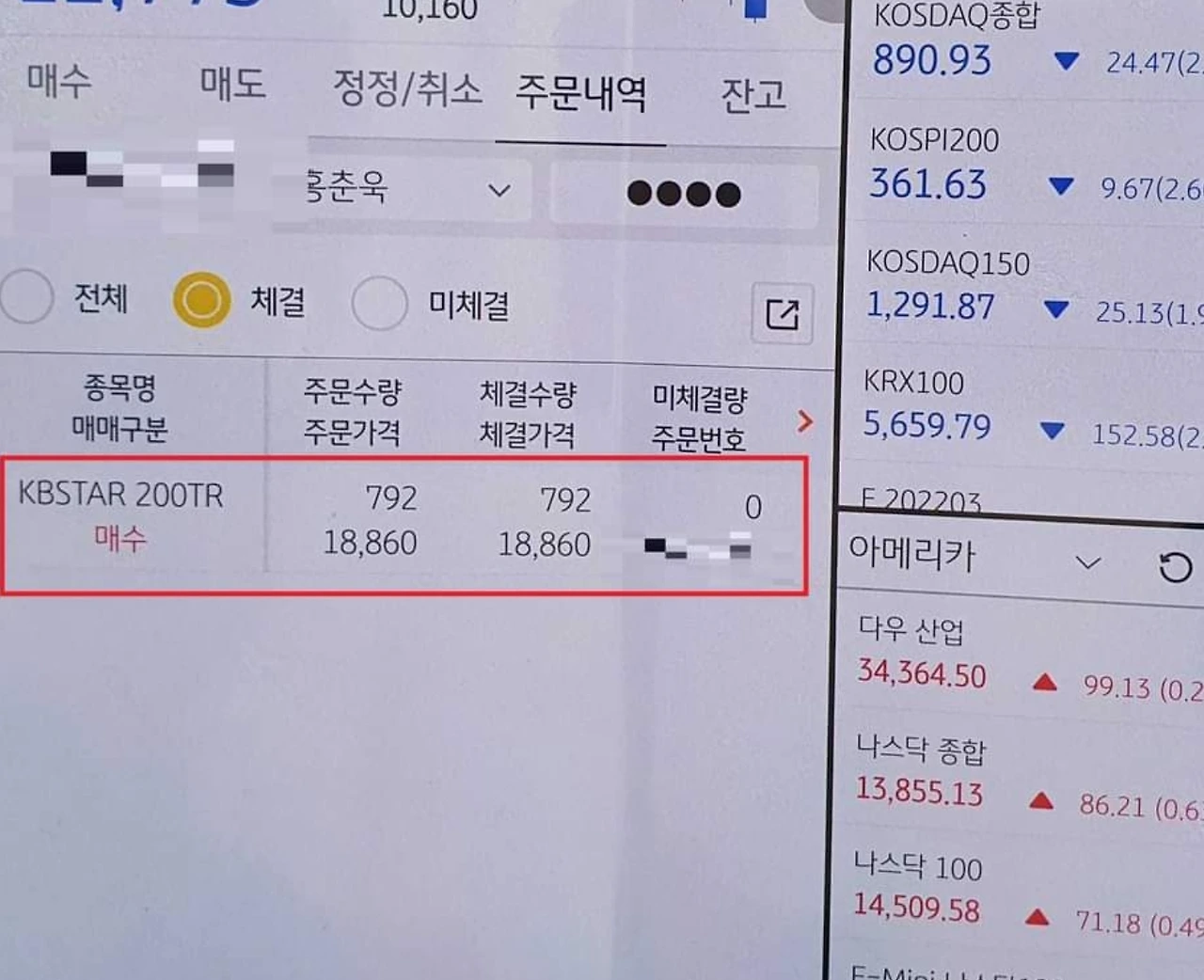 지난 해 12월 통계 기준으로, 한국 주식에 대한 매수 신호는 뚜렷하지 않습니다. 여러 지표 중에 단 하나(미국 소매판매)만 매수 신호가 발생했을 뿐입니다. 그런데.. 오늘 한국 주식을 매수했습니다. 아래 <사진>처럼, 코스피200 지수를 추종하는 ETF를 매수했죠. 물론 그렇게 큰 돈은 아닙니다만, 시장이 패닉을 일으킬 때에는 저가 매수로 대응하자는 마음으로 결행한 일이죠. 이 돈은 물론 미국 달러를 환전한 것입니다. 오늘 환율도 좋아서, 바로 결행했죠.