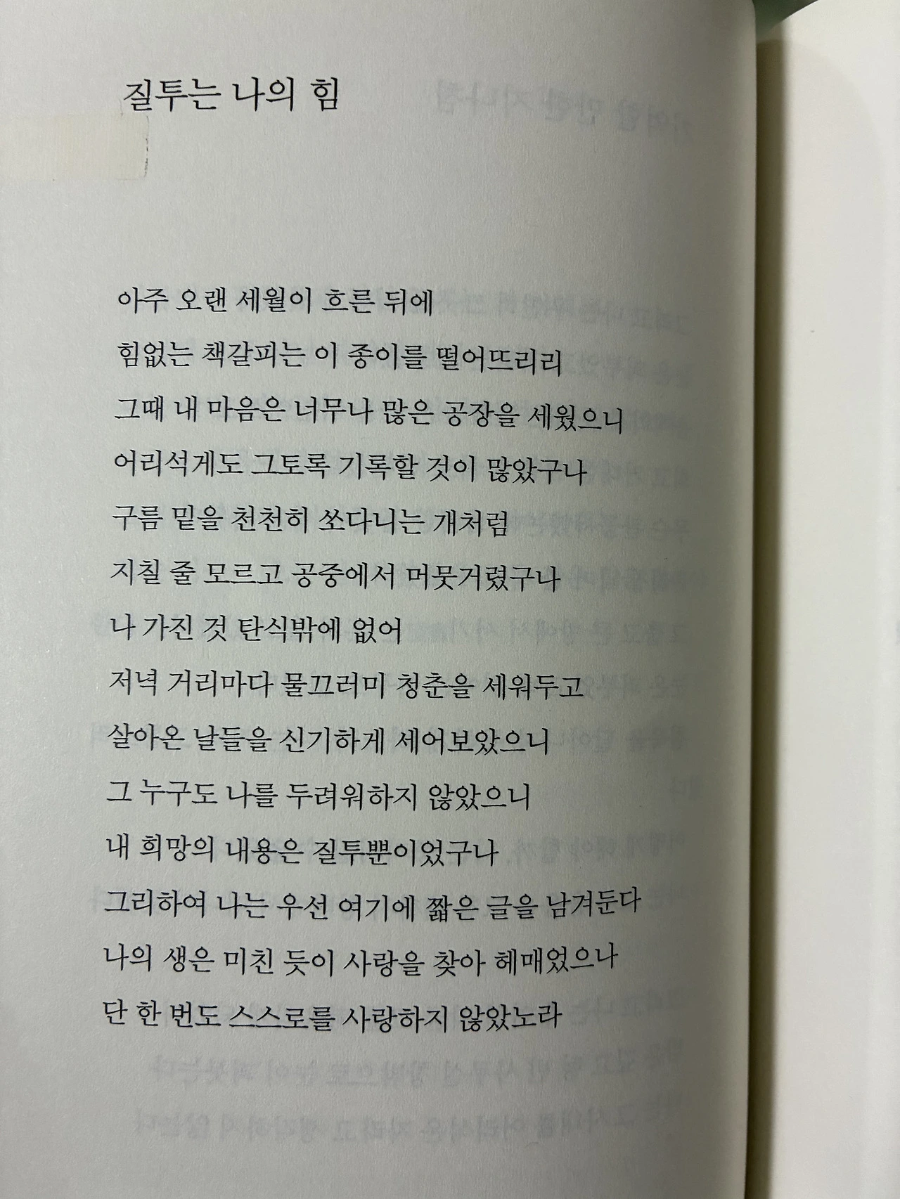 가장 좋아하는 시는 ‘질투는 나의 힘’이다. 시 속에서 화자는 젊음의 열정이 식을 만큼의 시간이 지난 미래의 시점(아주 오랜 세월이 흐른 뒤)을 가정하여 자신의 청춘(현재)을 성찰하고 있다. 이때 ‘이 종이’는 이 시를 쓰고 있는 종이를 의미하며, ‘책’은 개인의 삶 즉 청춘을 기록한 글을 의미한다. ‘힘없는 책갈피’가 ‘이 종이를 떨어뜨리’는 모습에서 독자는 화자의 젊은 시절 열정이 힘을 잃었음을 시각적으로 볼 수 있다.