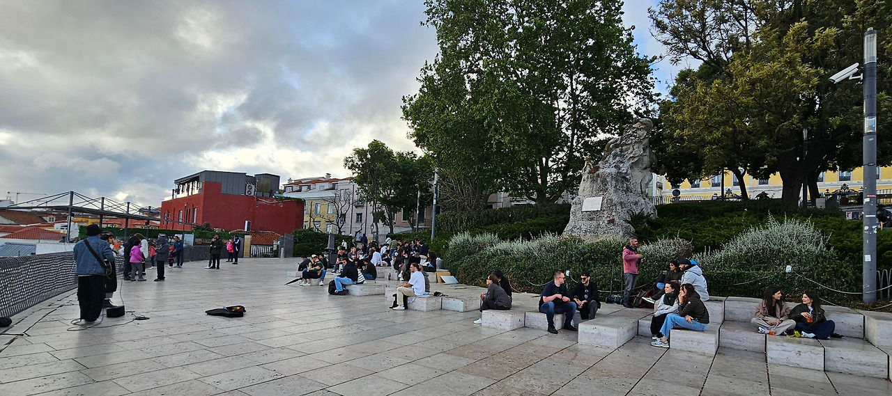 아래로 내려다보이는 거리에는 찬란한 건축과 함께 깊은 흔적도 겹쳐 있다. 살라자르 독재의 그림자, 민주화와 혁명의 열기, 알파마의 오래된 골목에 남은 저항과 희망의 서사들. 영화 속 아마데우가 걸었던 길이, 지금 내 눈앞에 펼쳐진 리스본의 골목들과 겹쳐졌다. 과거와 현재가 동시에 흐르는 풍경을 바라보며, 나는 이 도시가 단순한 여행지가 아니라 역사와 삶을 품은 또 하나의 ‘야간열차’ 임을 깨달았다. 짧은 머무름에도 전망대는 나에게 깊은 시간을 선물했다. 시민들의 쉼터이자 여행자들의 사색의 무대, 낮에는 고요한 정원으로, 밤에는 빛의 파노라마로 변하는 언덕 위의 이 테라스는 리스본이 들려주는 가장 잔잔한 세레나데였다.