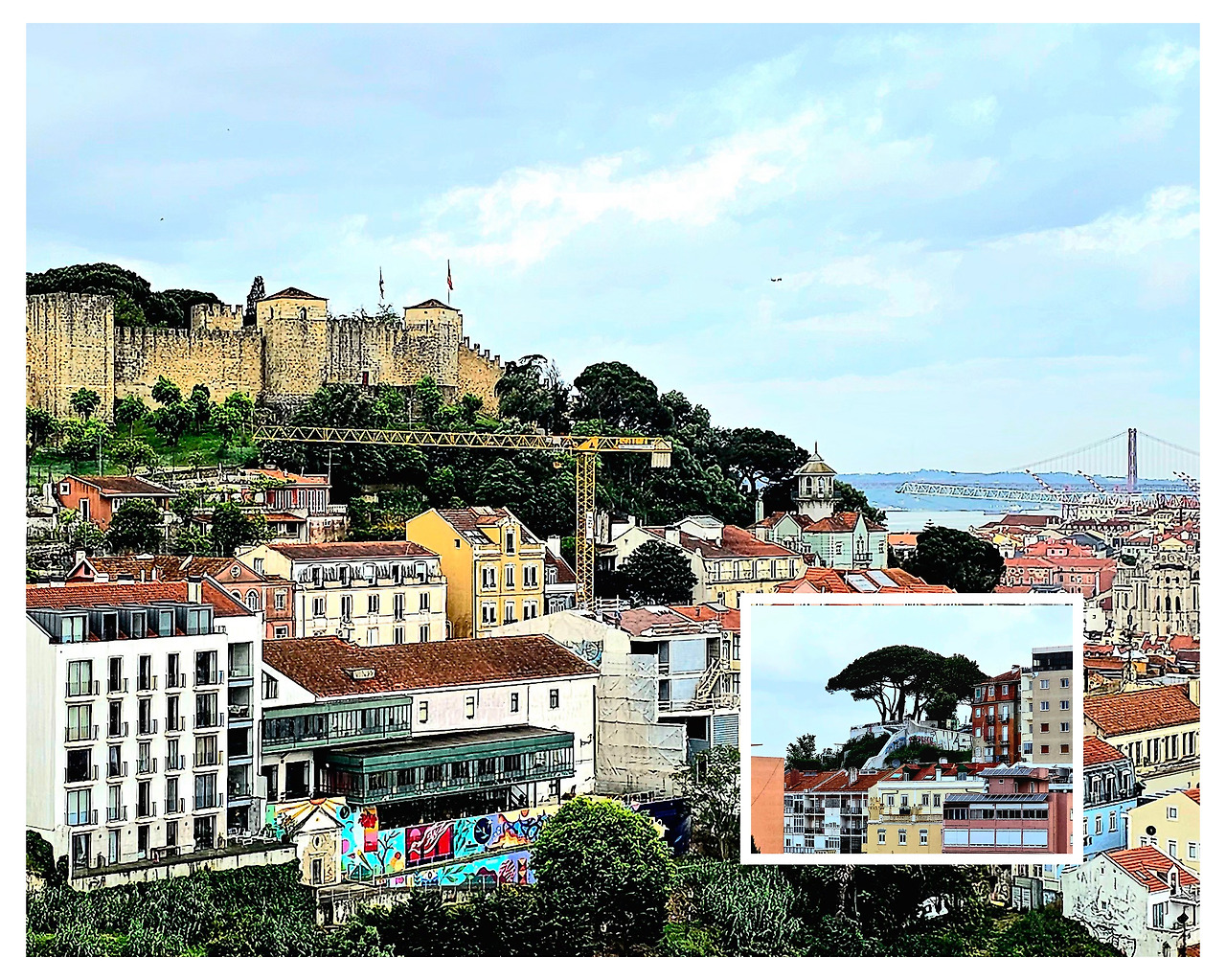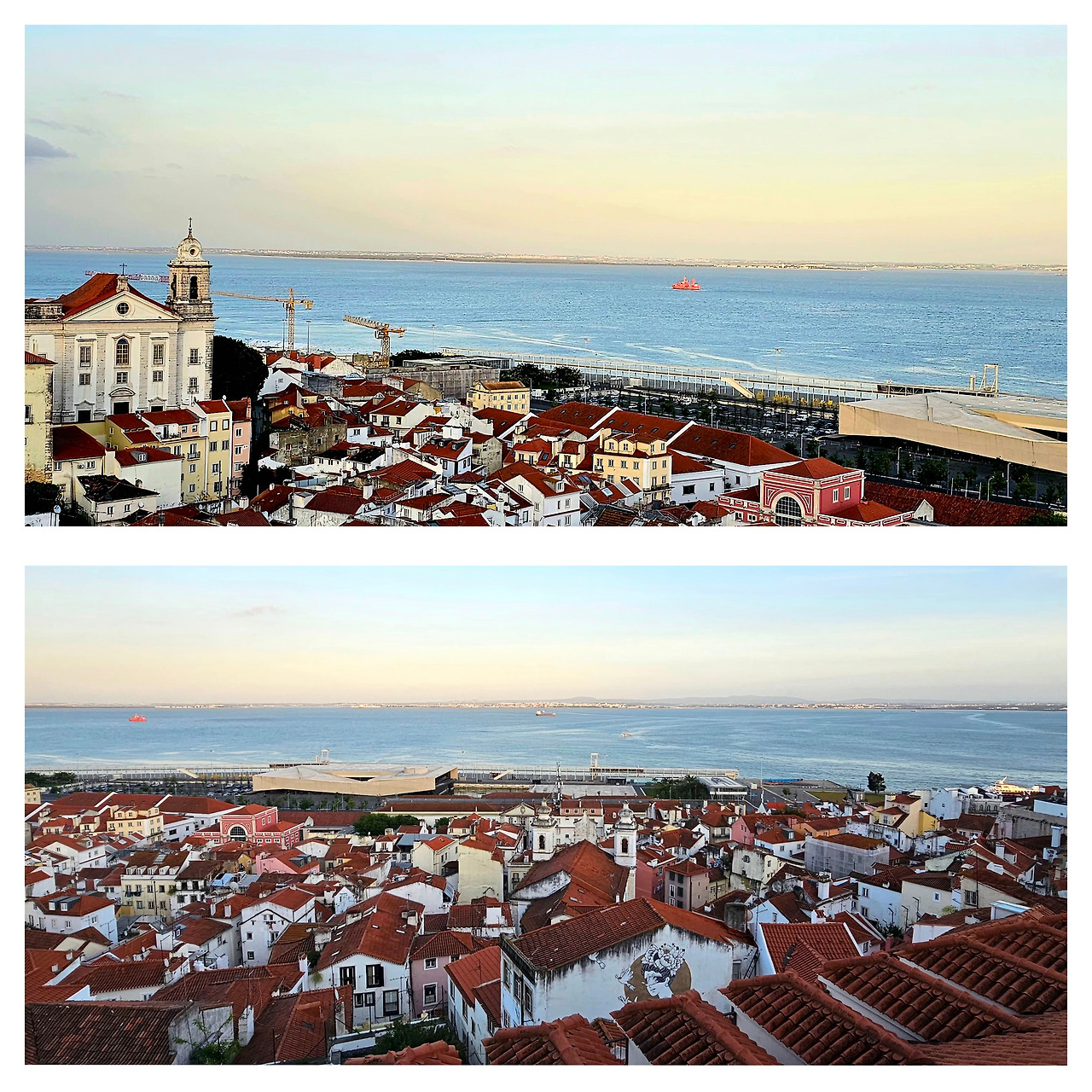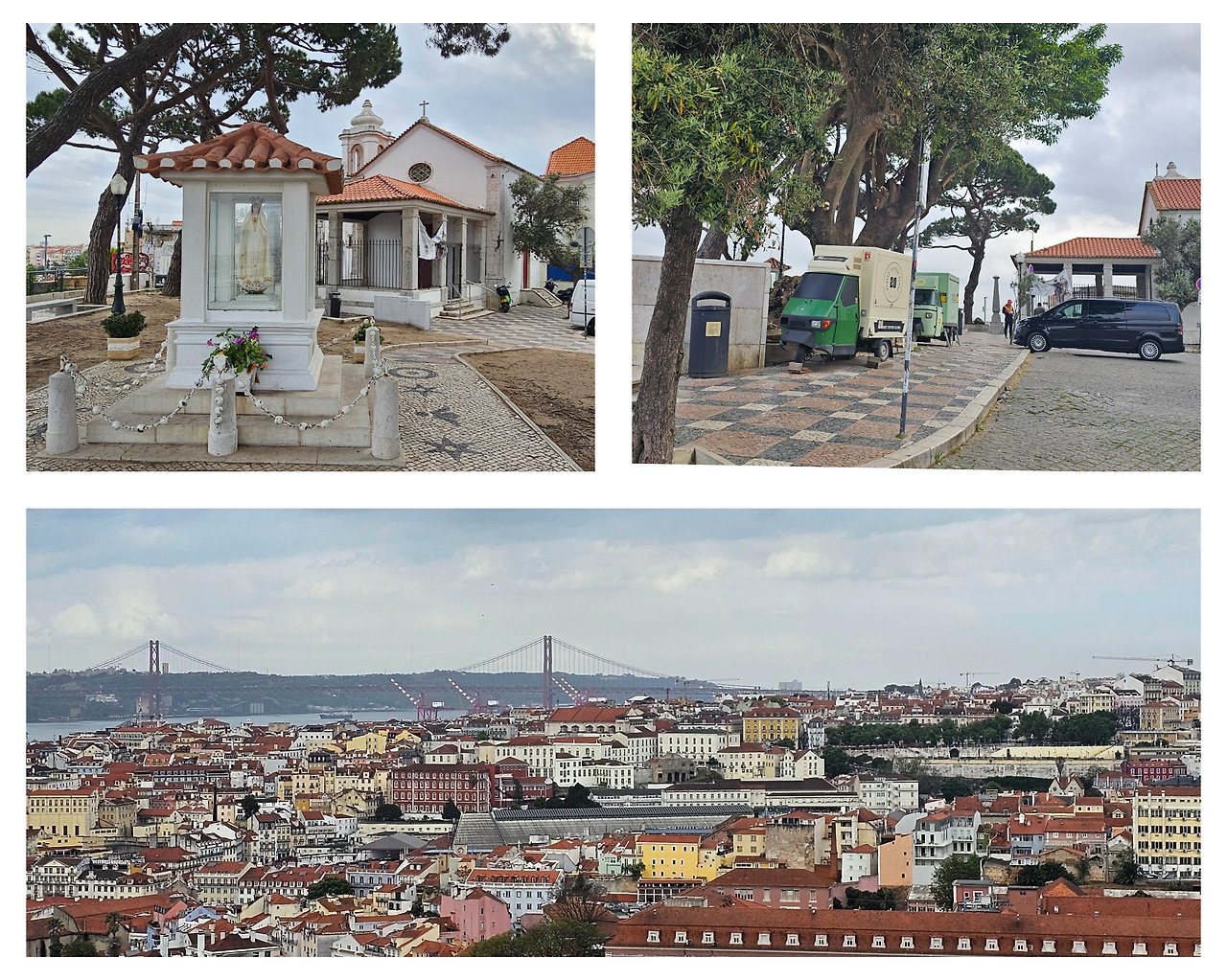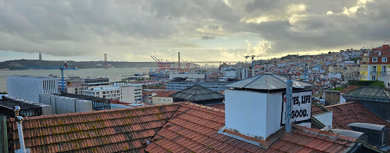 저 멀리 4월 25일 다리가 붉은 철골 구조로 테주강을 당당히 가로지르고, 강 건너편 언덕 위의 크리스토 레이 예수상이 두 팔을 벌려 도시 전체를 품에 안고 있는 모습이 장관이었다.