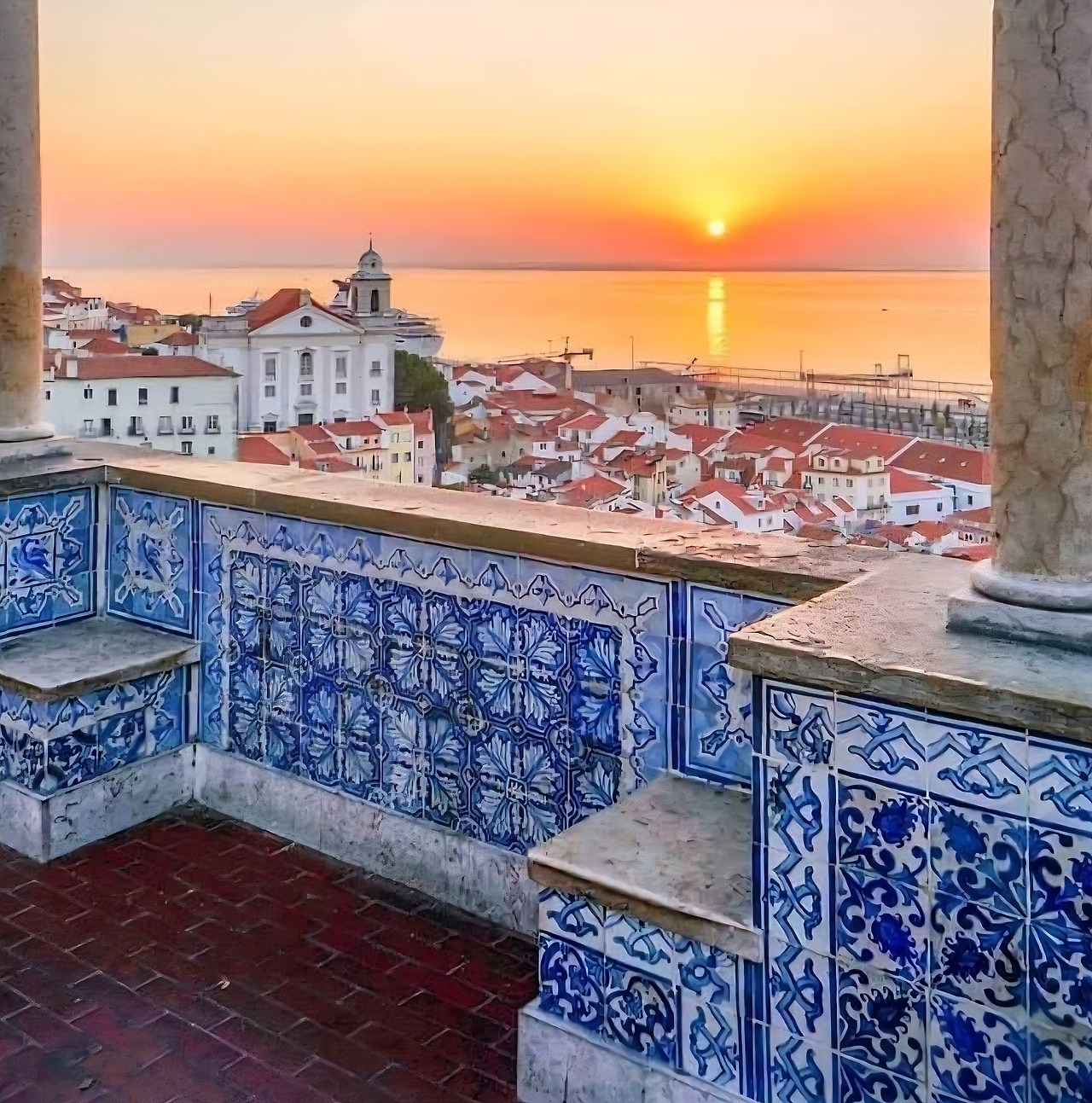 숨이 가빠질 즈음 마주하게 되는 풍경은 예상을 뛰어넘는다. 하얀 아치형 회랑이 지중해식 우아함을 자아내고, 그 사이사이 포르투갈 전통 타일 아줄레주가 파란 이야기를 속삭인다. 회랑 너머로는 테주강이 은빛 띠처럼 흘러가고, 발아래 펼쳐진 알파마의 붉은 기와지붕들이 마치 시간이 멈춘 듯 고요하게 겹쳐 있다.