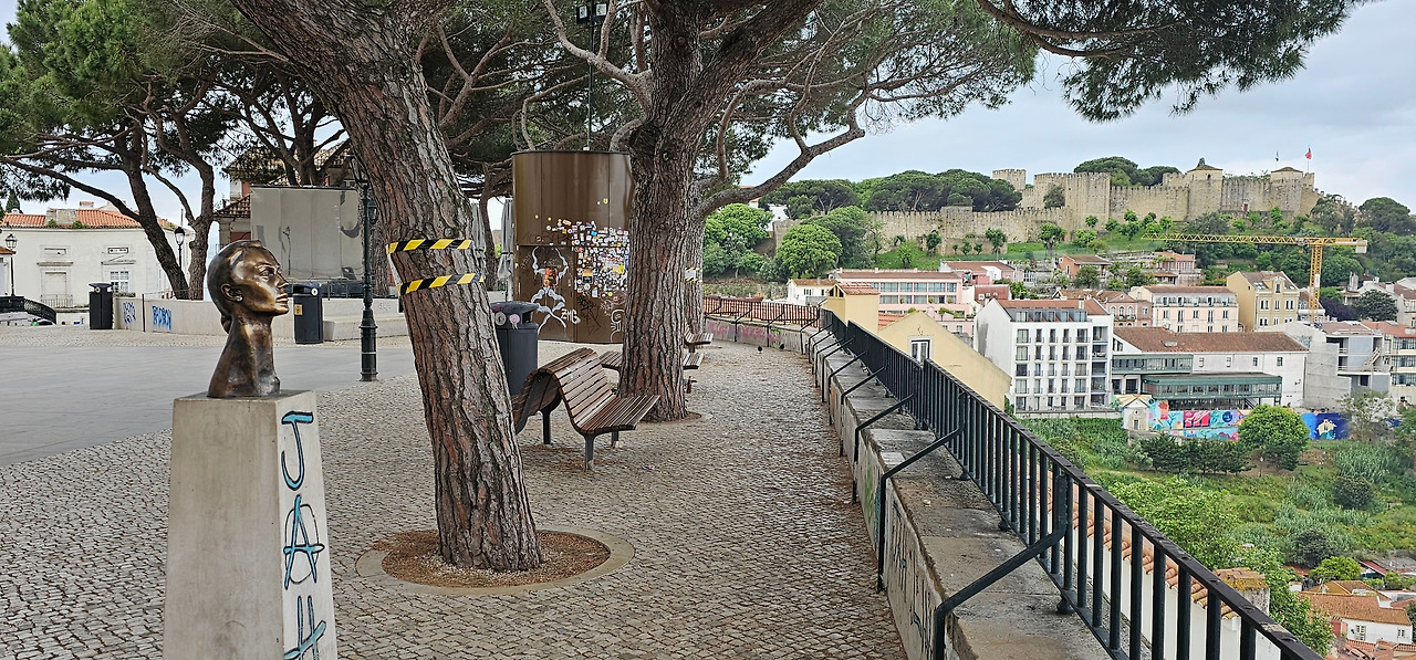 특히 인상적인 것은 리스본의 대표 시인 소피아 드 멜로 브레이네르 안드레센의 흉상이 자리하고 있다는 점이다. 포르투갈 문학의 거장을 기리는 이 조각상은 전망대에 깊이 있는 문학적 정취를 더한다. 우리가 찾아간 이른 아침 시간, 아직 도시가 완전히 깨어나기 전이라 그런지 방문객은 거의 없었다. 한낮이라면 북적일 테라스가 텅 비어 있어 처음엔 조금 어색했지만, 곧 이 고요함이 주는 특별한 매력을 발견하게 되었다.