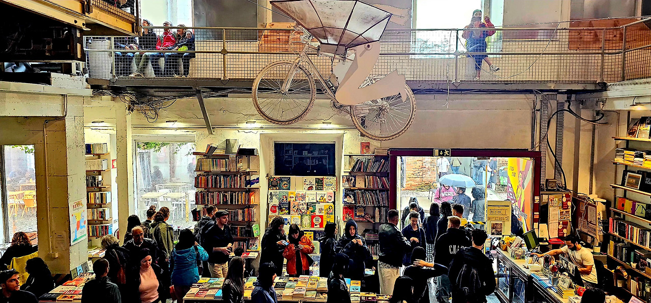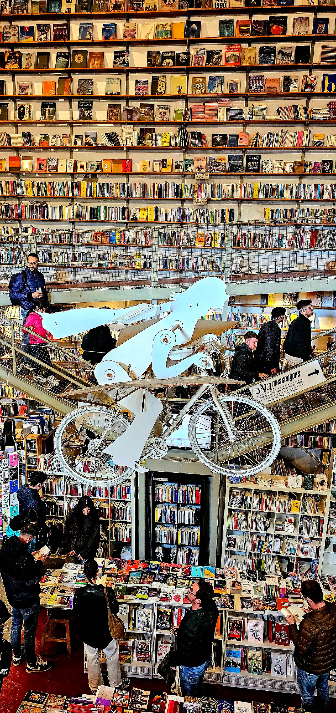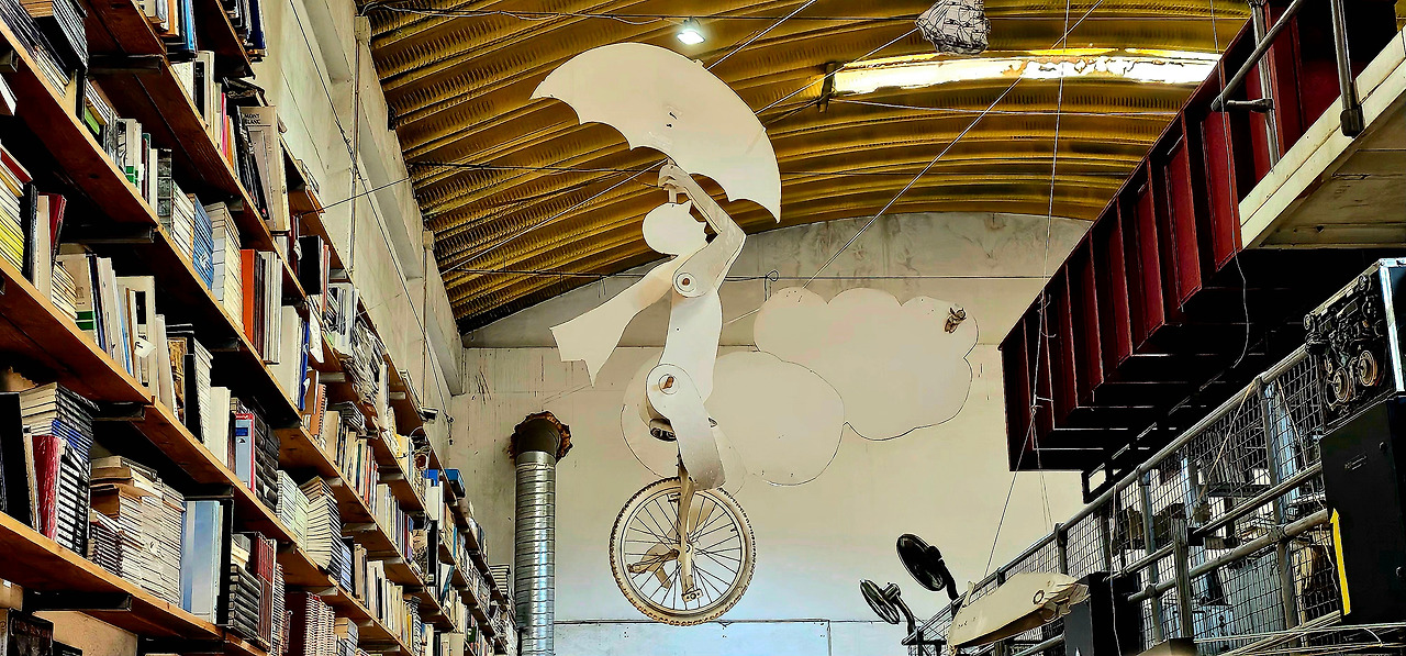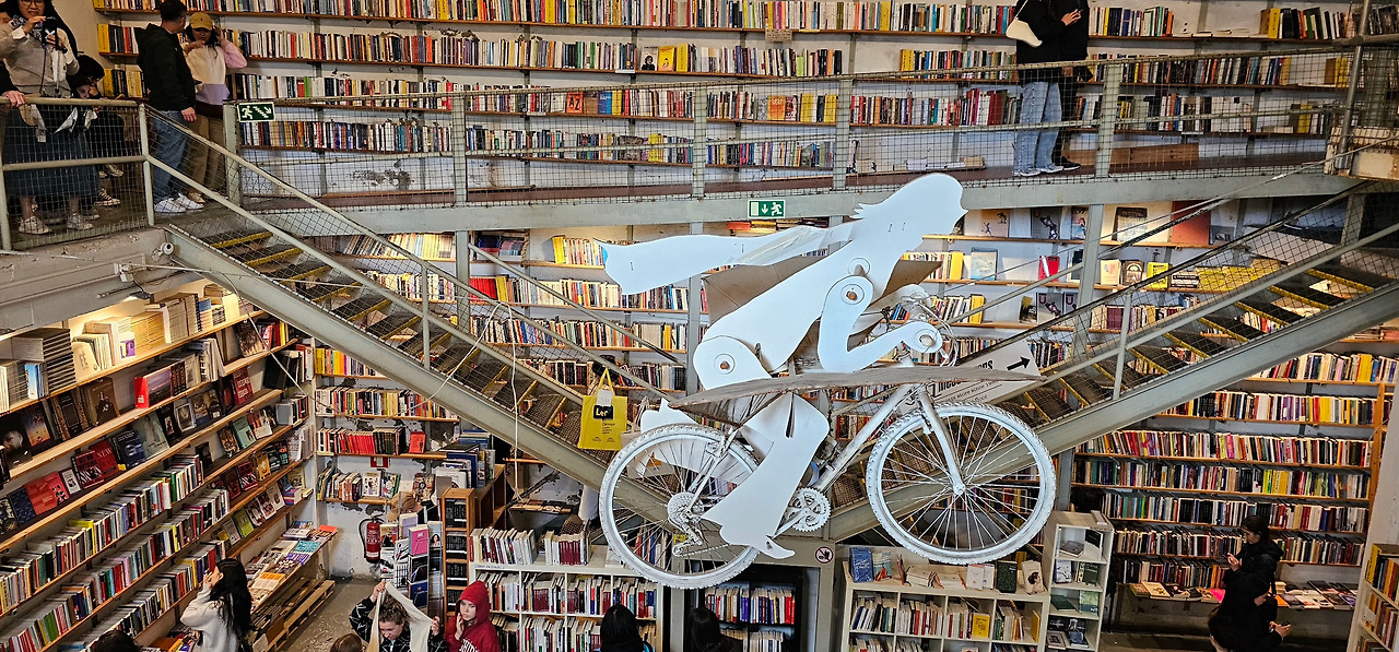 서점 문을 열고 들어서자마자 서늘한 공기와 함께 책 향기가 코끝을 간지럽혔다. 고요한 분위기 속에 은은한 조명이 벽돌 벽과 나무 책장을 감싸고, 빗방울이 유리창을 타고 천천히 흘러내리는 소리가 마치 배경 음악처럼 들려왔다. 서점 내부는 마치 오래된 기계 공장 건물의 흔적을 그대로 살려, 투박한 벽과 거대한 철제 기둥, 높은 천장이 어우러져 독특한 미학을 자아냈다. 가장 눈길을 끈 것은 천장에 매달린 거대한 날개 달린 자전거였다. 마치 시간이 멈춘 듯 그 자전거는 이곳이 단순한 책방이 아니라 하나의 예술 작품임을 조용히 말해주고 있었다.