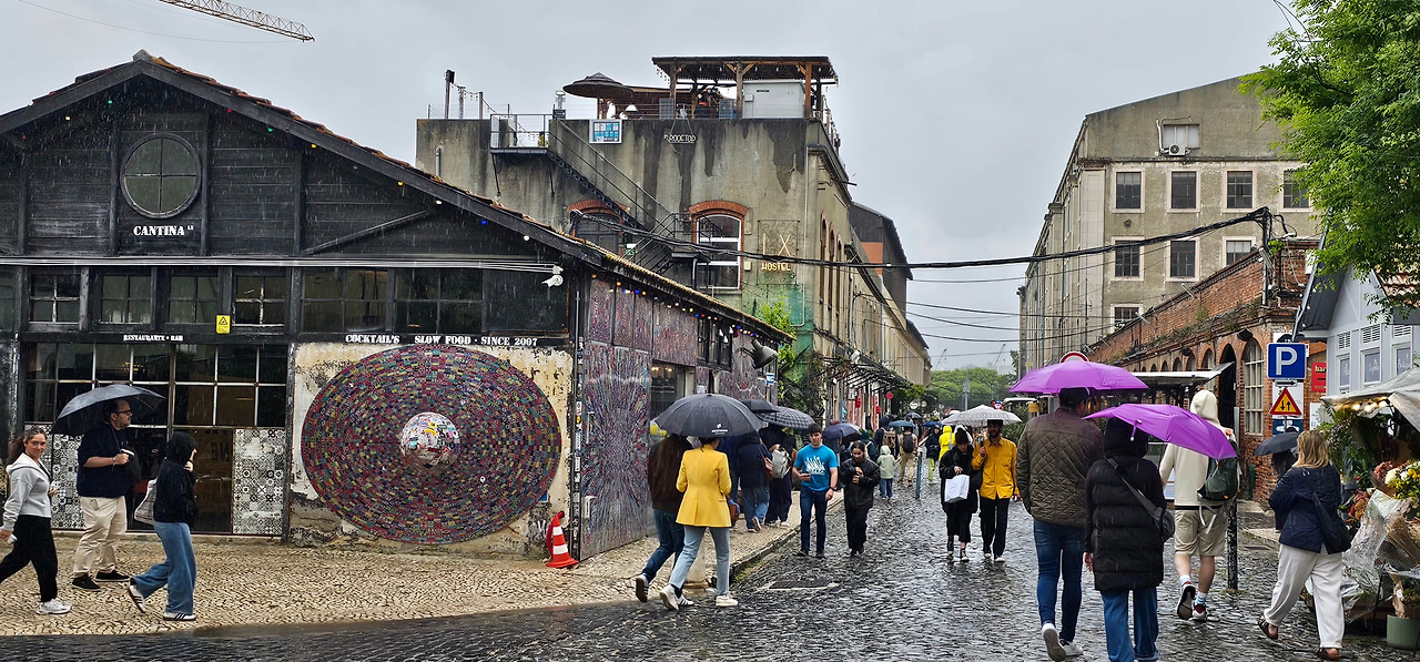 LX 팩토리는 오래된 산업 단지를 예술과 창작의 공간으로 탈바꿈시킨 곳으로, 리스본에서 가장 힙한 복합문화 공간 중 하나였다. 비가 오는 날이라 그런지 조용하고 차분한 분위기였다. 안으로 들어서자마자 비에 젖은 붉은 벽돌과 물기가 머금은 오래된 간판들이 이곳이 단순한 쇼핑몰이 아니라, 시간이 묻어난 살아있는 문화 공간임을 일깨워 주었다. 그라피티로 뒤덮인 벽과 골목 사이로 살짝 스며드는 빗소리는 마치 이곳의 숨결처럼 느껴졌다. 오래된 공장 건물들이 차분하게 자리 잡고, 그 사이사이로 개성 넘치는 상점들과 아트 갤러리가 모여 있었다. 비에 젖은 돌바닥 위로는 우산을 든 사람들이 느릿느릿 걸음을 옮겼고, 곳곳에서 고즈넉한 음악 소리가 흘러나왔다.