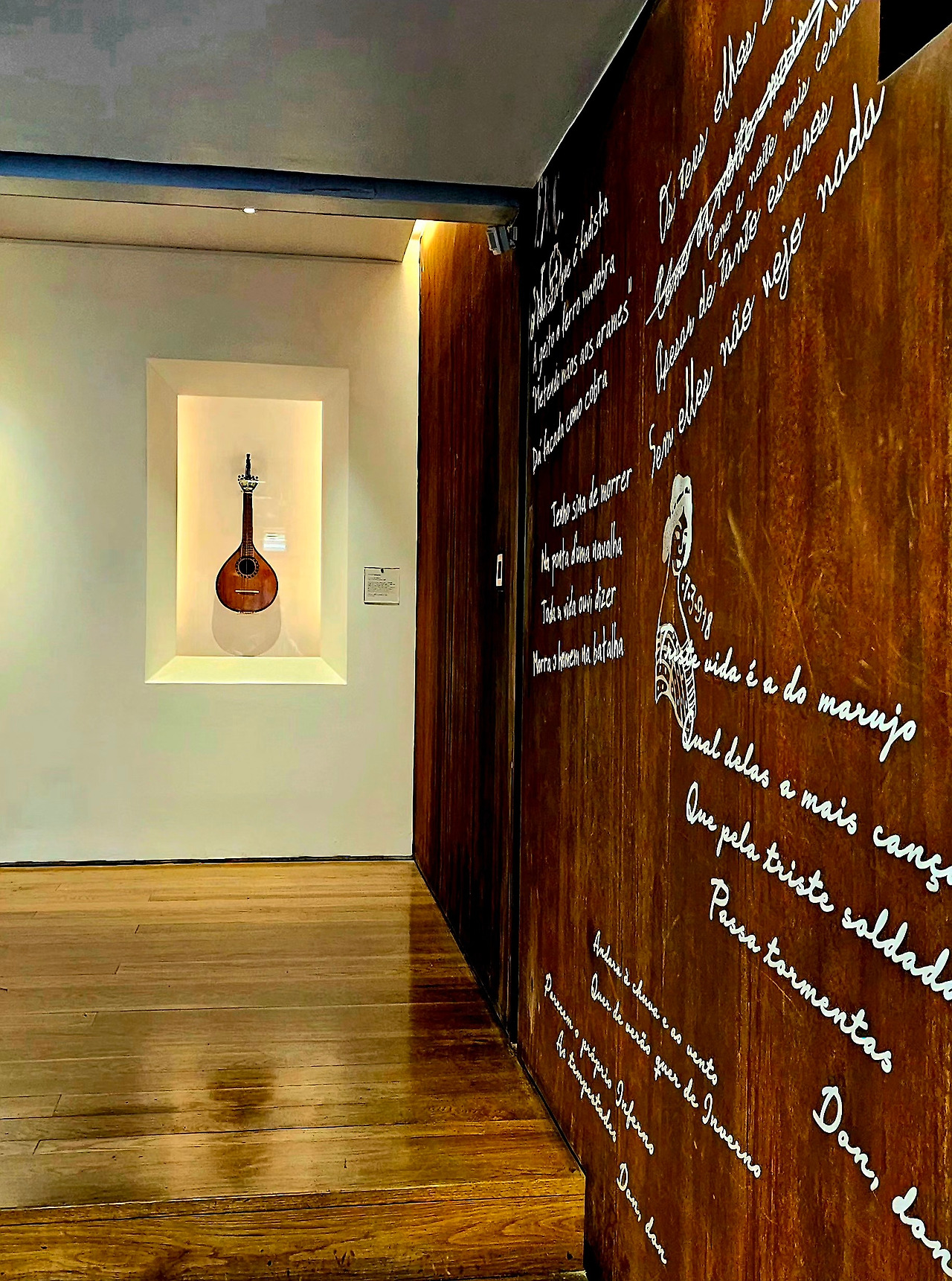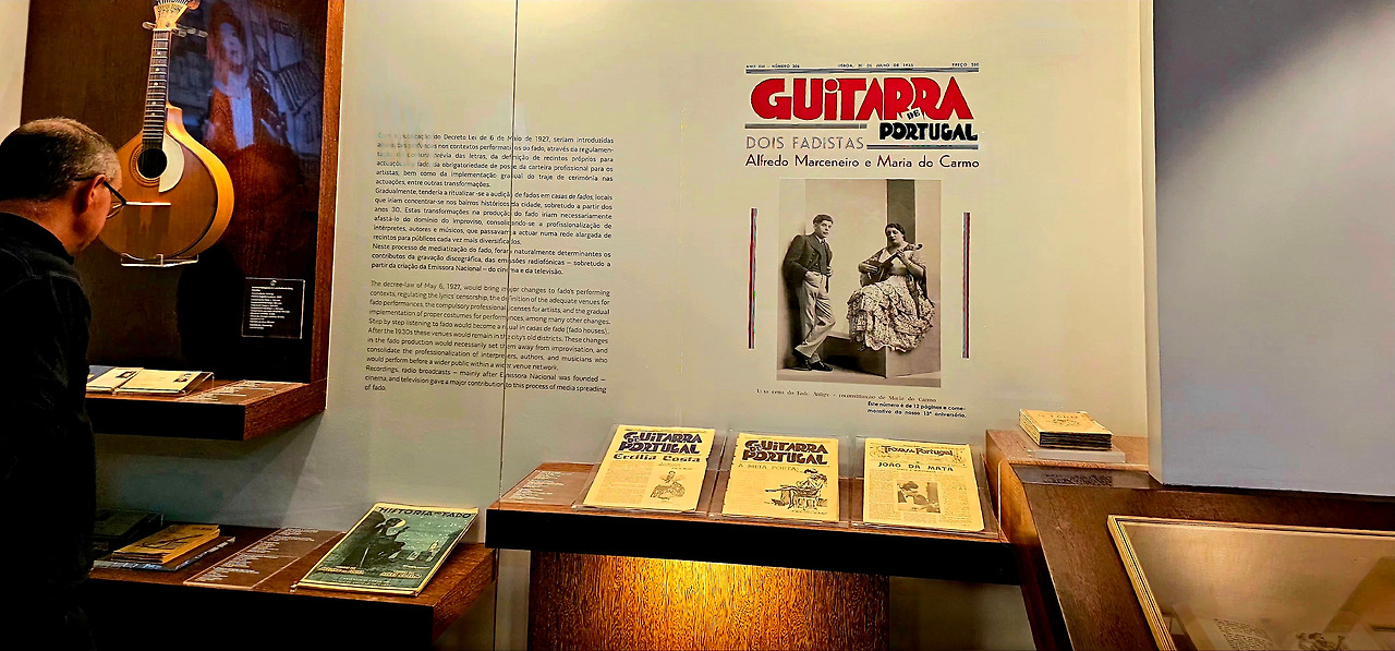 전시는 파두의 기원과 사회적 배경부터 시작됐다. 19세기 리스본의 골목과 선창, 파두를 부르던 여성들의 초상화, 그리고 당시 실제로 사용된 포르투갈 기타와 의상들이 섬세하게 진열되어 있었다. 특히 포르투갈 기타의 아름다운 곡선과 금속 줄은 그 자체가 하나의 예술품 같았다.