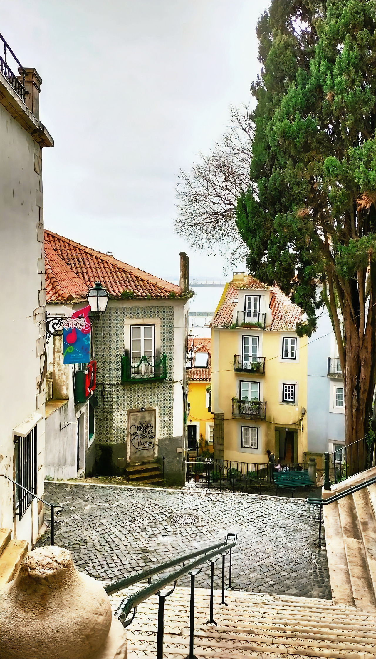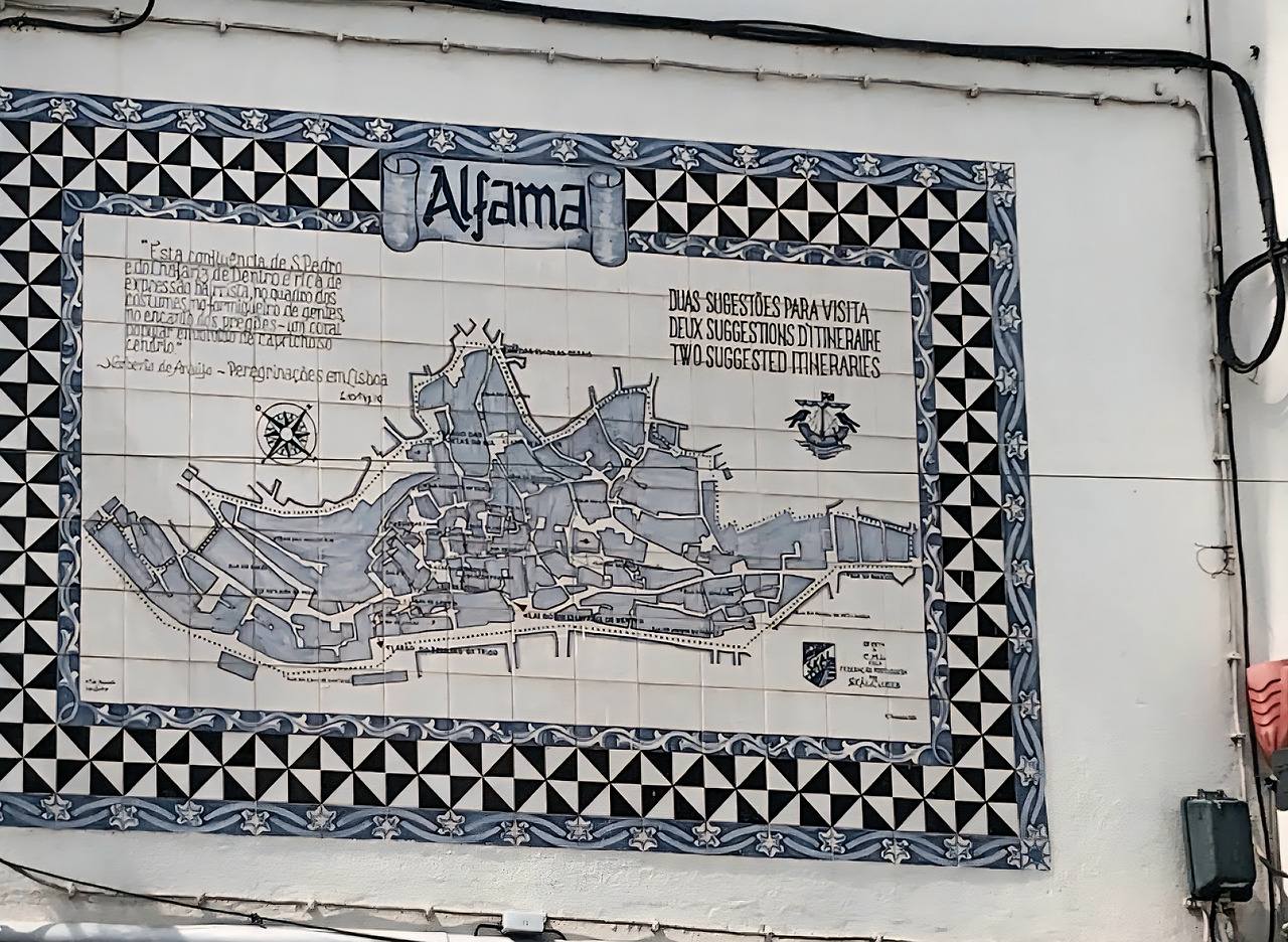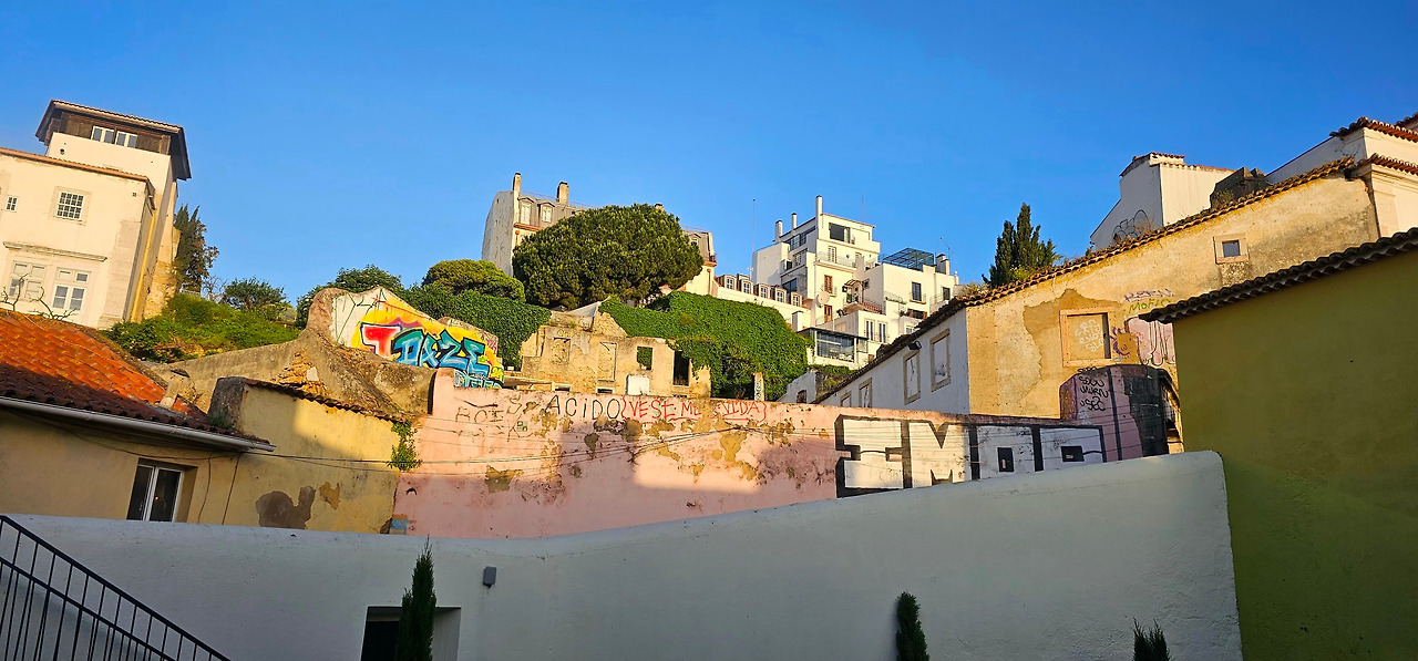 리스본의 알파마 지구는 구불구불한 골목길과 끝없는 계단, 벽을 타고 흐르는 담쟁이덩굴, 그리고 햇살에 바랜 아줄레주 타일이 어우러진 곳이다. 이 오래된 동네를 걷다 보면 곳곳에 벽화들이 눈에 띈다. 그중에서도 두 곳의 벽화가 특히 기억에 남는다.