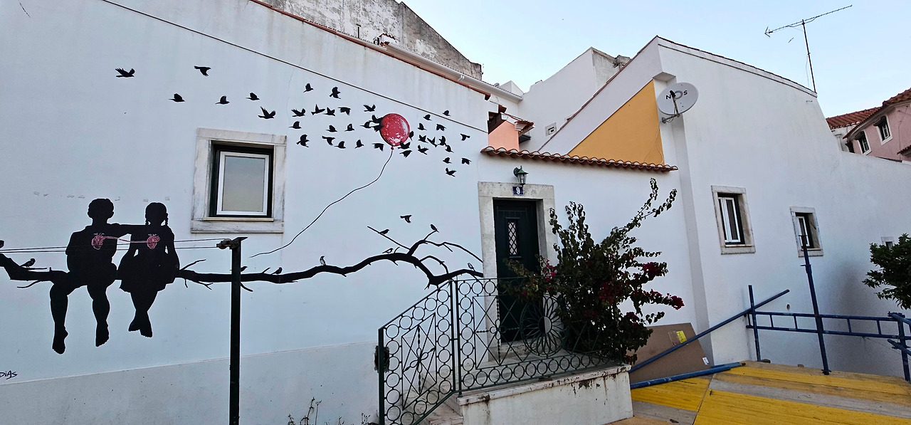 구글 지도 대신 알파마 골목길로 걸었다. 좁고 구불한 길은 미로 같았고, 집집마다 걸린 빨래, 나른한 고양이, 희미하게 들리는 파두 선율이 알파마만의 독특한 분위기를 만들어냈다. 어둑해진 골목에서 가로등 불빛 아래 하얀 벽면의 거대한 벽화를 발견했다. 화려함 없이 절제된 선과 여백으로 강렬한 인상을 주는 작품이었다. 검은 실루엣과 붉은색이 대비를 이뤘다.