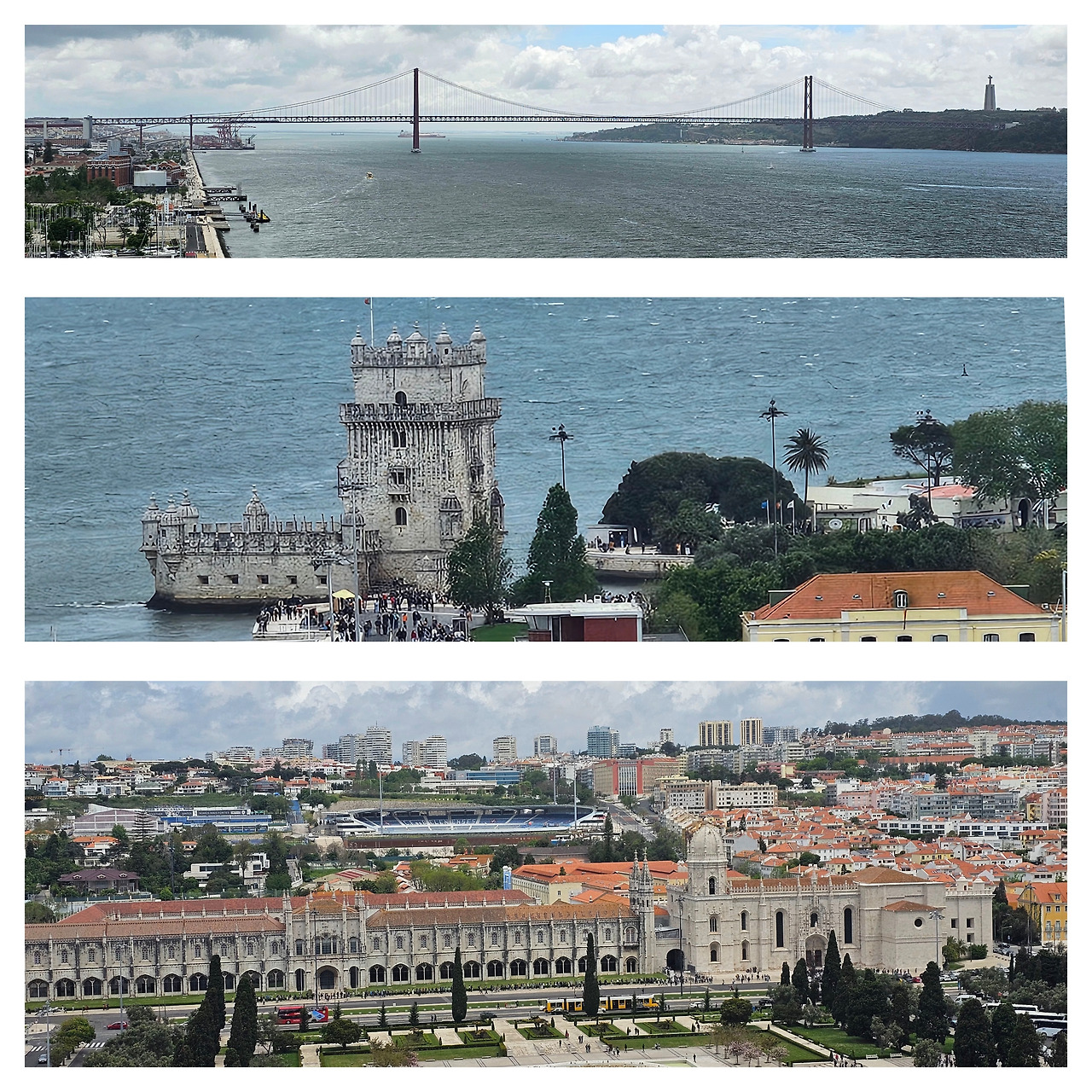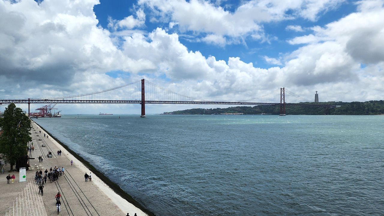 전망대에 오르니 테주강과 제로니무스 수도원 너머 있는 리스본 시내, 붉게 빛나는 4. 25 다리가 한눈에 들어왔다. 테주강 건너 보이는 거대한 예수상은 두 팔을 벌린 채 도시를 바라보고 있었다.