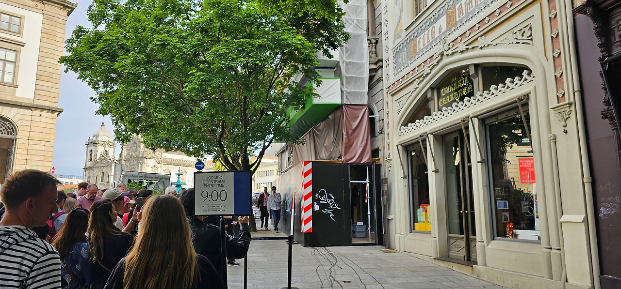 포르투에 도착한 다음 날 아침 8시 45분, 우리는 다시 서점으로 향했다. 흔히 '오픈런'이라 불리며 인파가 북적이는 풍경을 예상했지만, 실제로는 미리 예약된 시간에 맞춰 줄을 서서 입장하는 방식이었다. '먼저 온 사람이 먼저 들어간다'라기보다는 "예약한 시간에 정해진 자리에서 차례를 기다린다"는 느낌이 더 강했다. 덕분에 혼란스러움 없이 질서정연하게 입장을 기다릴 수 있었다. 좁은 서점 앞 인도에는 이미 몇몇 사람들이 모여 있었고, 이른 아침의 포르투는 놀랍도록 차분했다. 회색빛 돌담 위로는 부드러운 햇살이 내려앉아 고즈넉한 도시에 따스한 기운을 더했다.