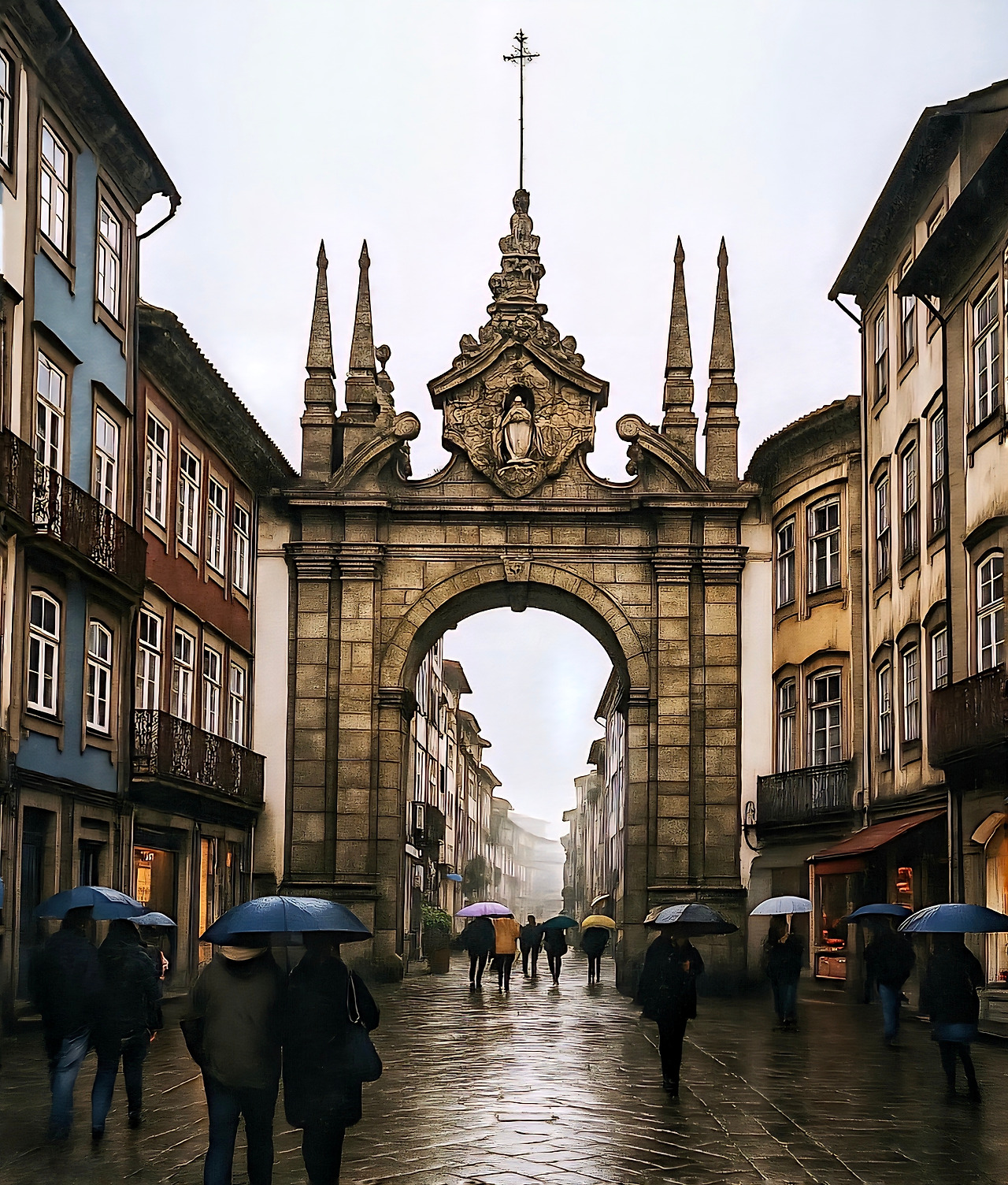 도심을 걸으며 빗속에서 더욱 선명한 윤곽을 드러내는 아르코 다 포르타 노바(Arco da Porta Nova)가 눈앞에 나타났다. '새로운 입구의 아치'라는 이름에 걸맞게, 18세기 바로크 장식을 간직한 석문이 흐린 회색 하늘을 배경으로 묵묵히 서 있었다. 우산을 기울이며 아치 밑을 지나자 빗방울이 포석 위에 부드럽게 부딪히고, 젖은 돌길이 은빛 물결처럼 반짝였다.