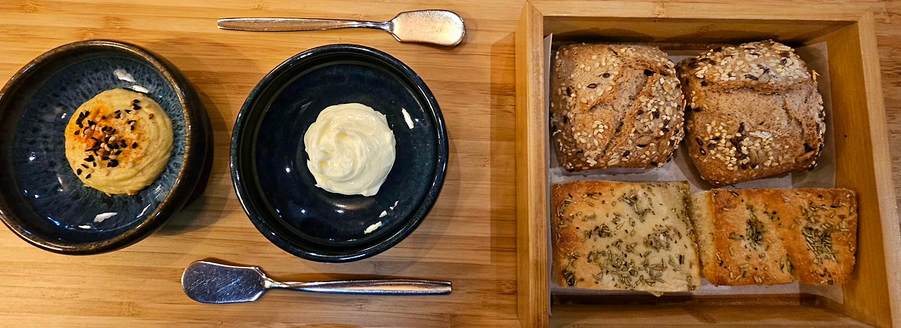 친절한 직원의 도움으로 몇 가지 음식을 주문했다. 처음 제공된 식전빵은 수제 곡물빵과 허브 포카치아, 그리고 아조레스 버터와 후무스 스프레드였다. 깊고 진한 풍미의 버터는 부드럽게 녹아들었고, 포카치아와 어우러져 고소한 우유 향을 입안 가득 채웠다. 후무스는 전통적인 맛에 흑깨와 파프리카 가루가 더해져 미묘한 오리엔탈 뉘앙스를 풍겼고, 고소함 뒤에 은은한 매콤함이 입맛을 조심스럽게 깨웠다. 곡물빵은 폭신한 속과 견고한 껍질의 대비가 좋았고, 씹을 때마다 곡물의 향이 풍성하게 터져 나왔다.