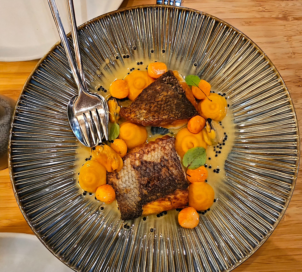 메인 요리인 농어구이는 시각적으로나 맛에서나 탁월한 균형을 보여주었다. 농어는 기름 없이 바삭하게 구워진 껍질이 칼질할 때마다 사각 소리를 냈고, 속살은 완벽한 미디엄 쿠킹으로 촉촉하게 유지되어 담백한 바다의 맛이 고스란히 살아 있었다. 간결하게 조리된 홍합은 짭조름한 해산물의 풍미를 더했고, 얇게 슬라이스 되어 돌돌 말린 당근은 단맛과 스모키 한 뉘앙스를 동시에 전했다. 접시 바닥에 깔린 살짝 감귤류의 산미가 있는 소스는 전체적인 균형을 잡아주며, 마치 해안선을 따라 걷는 여름 저녁의 청량함과 따뜻함, 그 모든 감각을 이 한 접시가 대신하는 듯했다.