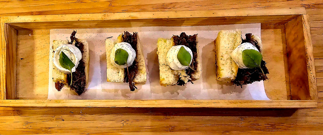 마지막으로 나온 소꼬리 샌드위치와 트러플 소스는 겉보기엔 가장 단순했지만, 가장 깊은 풍미를 품고 있는 미니어처 극장 같았다. 오랜 시간 조려진 소꼬리 고기는 젤라틴처럼 녹는 질감과 진한 풍미를 자랑했고, 부드러운 포카치아와 이상적인 밸런스를 이뤘다. 위에 올려진 크림은 트러플과 생크림이 어우러진 휘핑으로, 코끝을 자극하는 향과 함께 깊은 감칠맛을 더했다. 작지만 인상적인 이 한 입은 미식이란 단어의 깊이를 다시 한번 되새기게 했고, 기억 속에 오래 남을 "한 입의 감동"이었다.