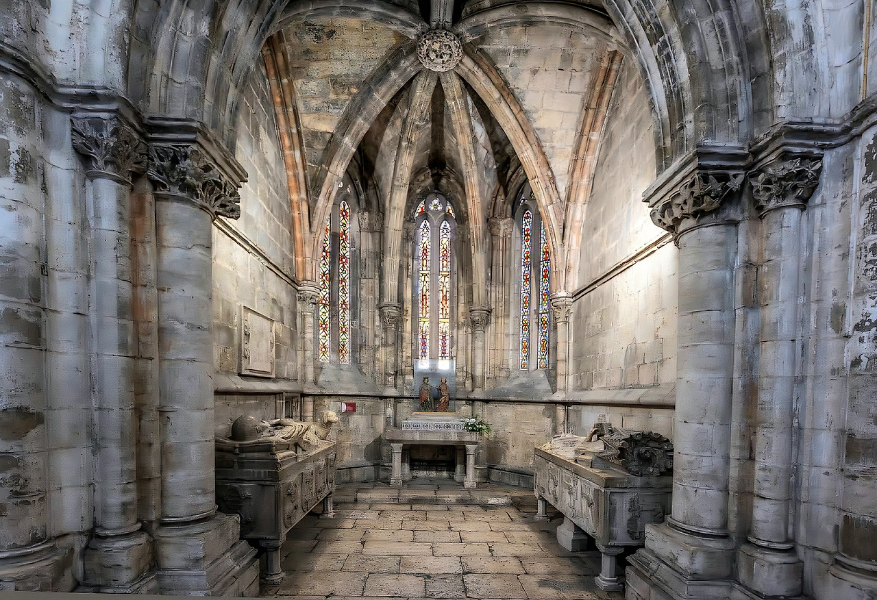 옆 회랑으로 들어서니 분위기가 달라졌다. 작은 정원을 둘러싼 고딕의 아치형 복도는 본당보다 훨씬 아늑했다. 햇살이 기둥 사이로 스며들며 빛과 그림자를 번갈아 새기고, 그 단순한 반복이 아름다운 리듬을 만들었다. 성당 깊은 곳의 예배당은 더욱 엄숙했다. 석관이 놓인 채 고요히 숨 쉬는 공간, 색유리창을 통해 들어온 빛이 왕족의 무덤 위에 신비로운 기운을 더한다.
