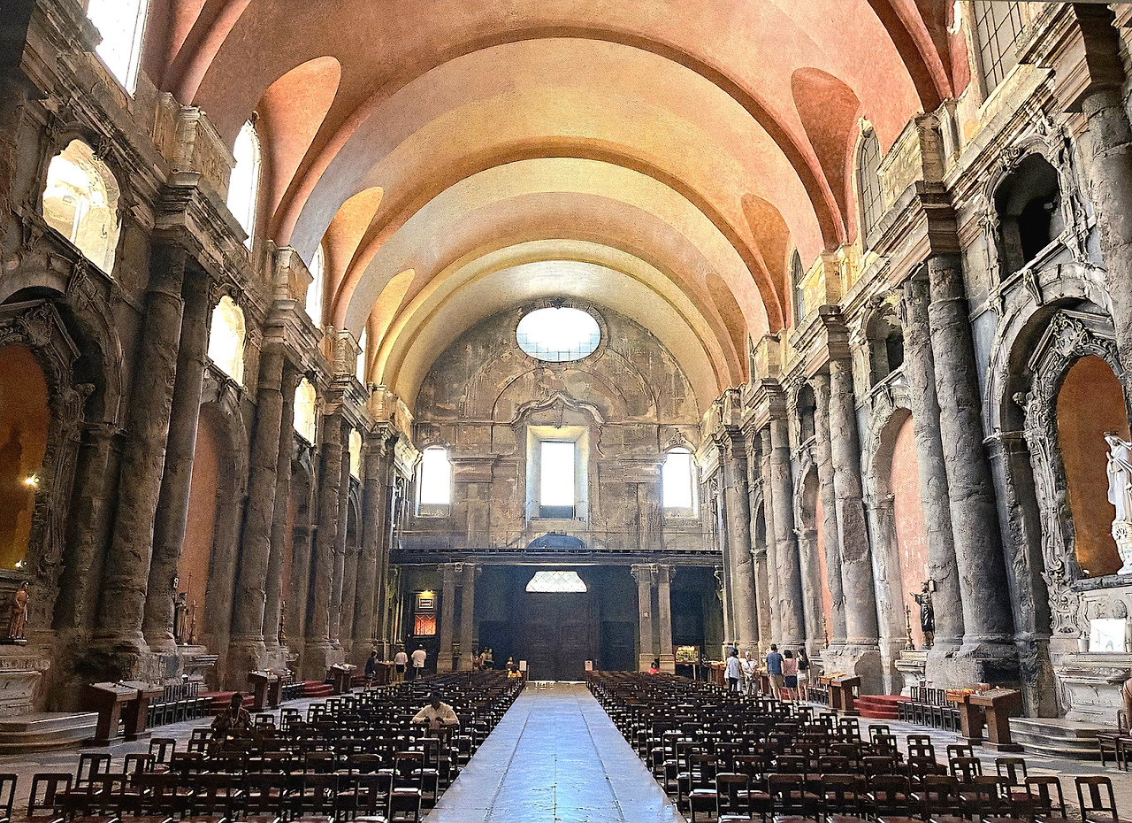 성당의 입구에 서자마자, 한 도시가 겪어온 고통의 흔적이 압축된 듯한 풍경이 눈에 들어왔다. 대지진과 화재로 검게 그을린 벽면은 시간이 흘러도 지워지지 않는 상처처럼 성당의 표면에 남아 있었고, 그것이 오히려 신앙의 무게를 더 실감하게 했다. 마치 인간의 연약함과 동시에 버텨온 역사의 강인함을 말해주는 증언 같았다. 높은 천장, 회색빛 기둥이 굵직하게 서 있지만, 진짜 시선을 붙잡는 것은 검게 그을린 벽과 탄 자국이었다. 기둥이 갈라진 그대로, 돌벽에 그을음이 남은 그대로였다. 그러나 이상하게도 이 흔적은 슬픔보다는 경외감을 불러일으킨다. 화려한 장식이 사라진 자리, 남아 있는 것은 오히려 꺾이지 않고 버텨낸 의지였다.