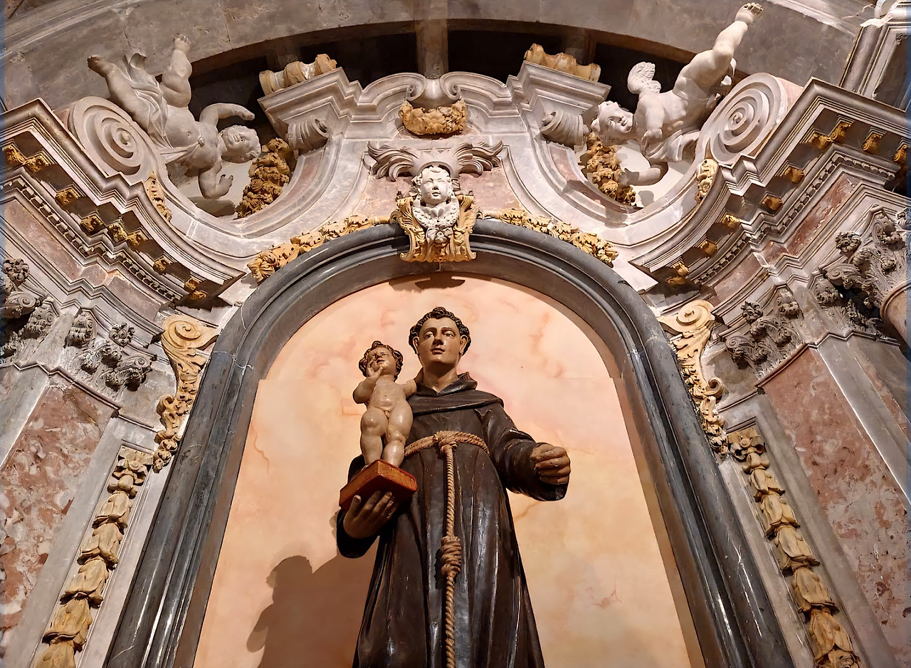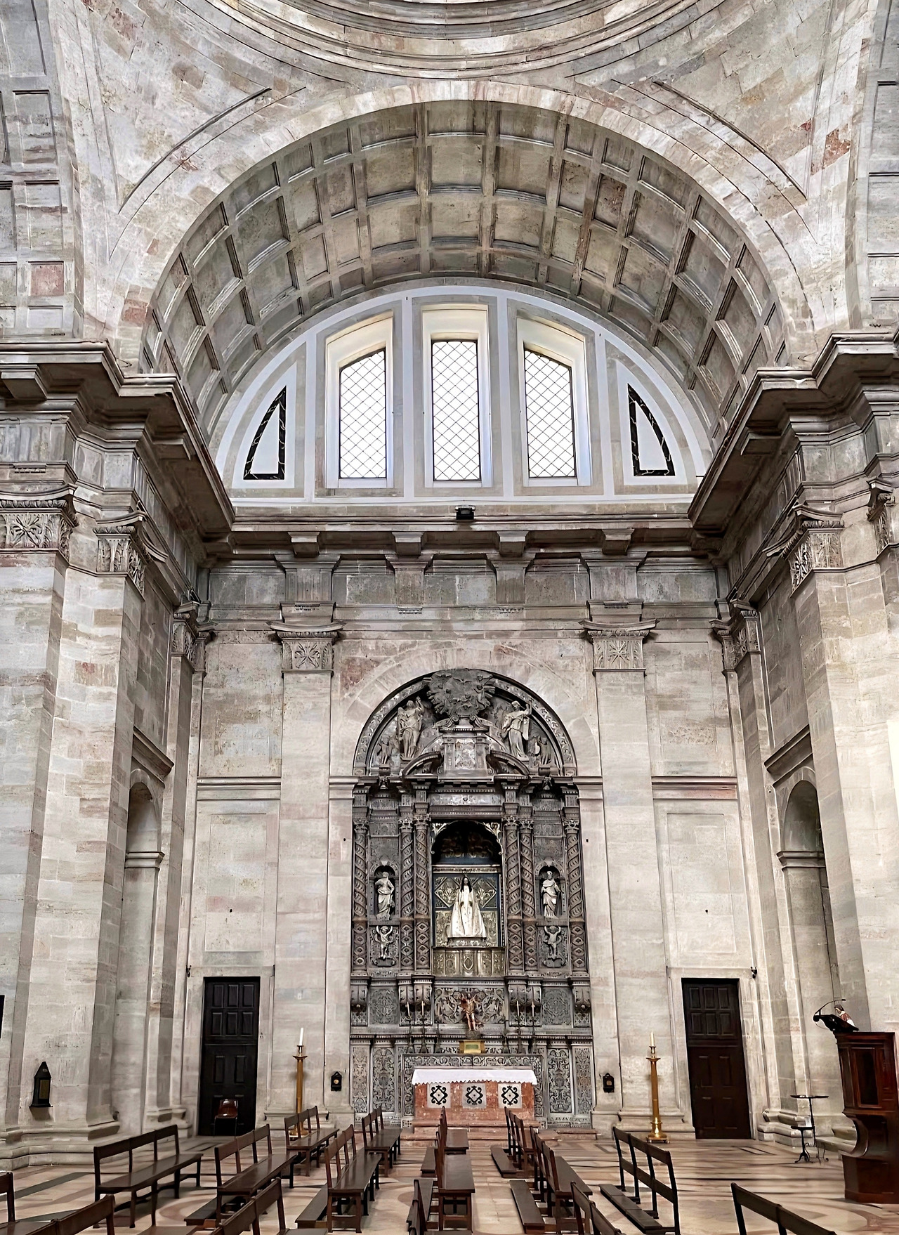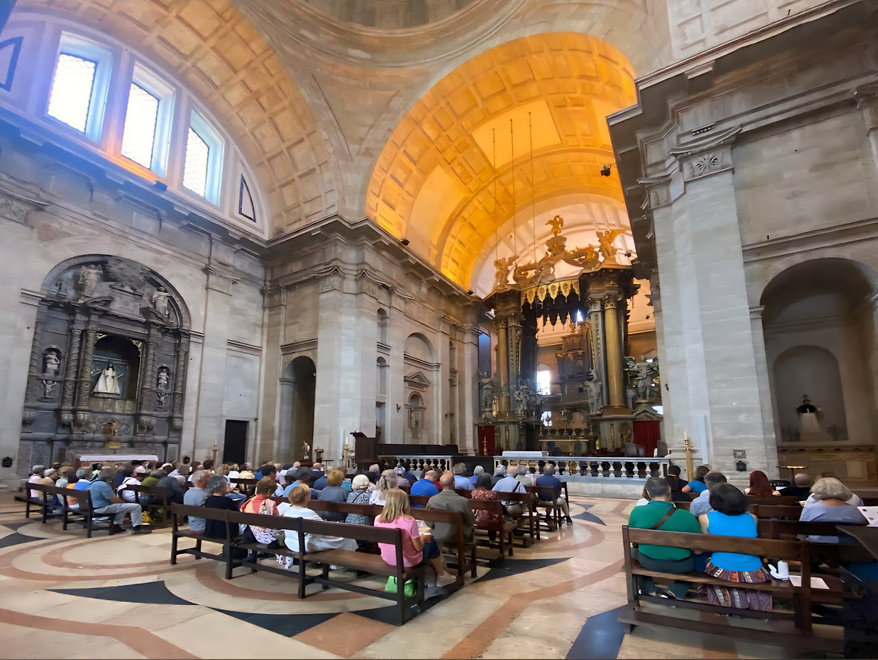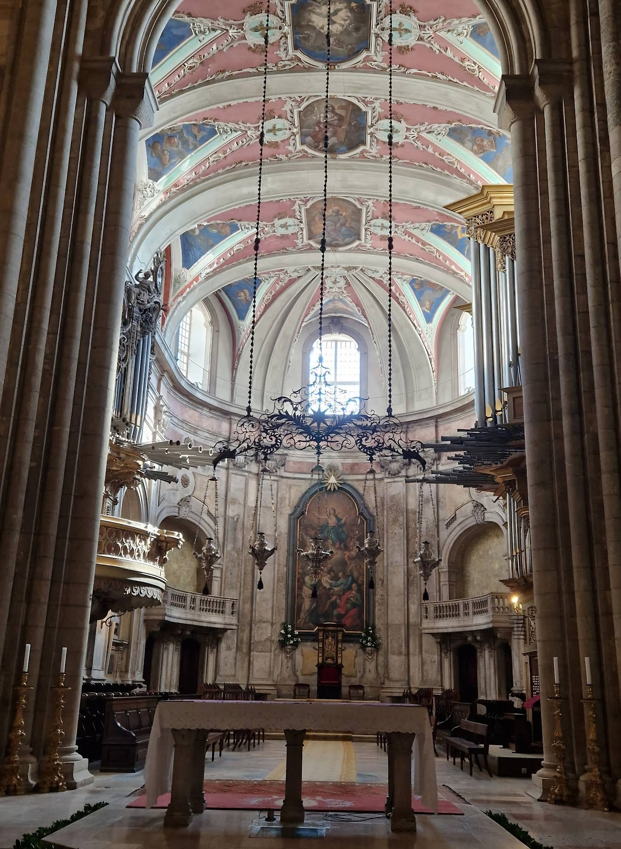 본당 중앙에서 제단을 바라보면 자연스럽게 시선이 천장으로 향한다. 로마네스크의 둥근 아치가 차례차례 이어지고, 그 위로는 바로크 시대의 화려한 천장화가 겹쳐 있었다. 800년이 넘는 세월이 켜켜이 쌓였지만, 화려함보다 고요하고 장엄한 분위기가 공간을 채우고 있었다.