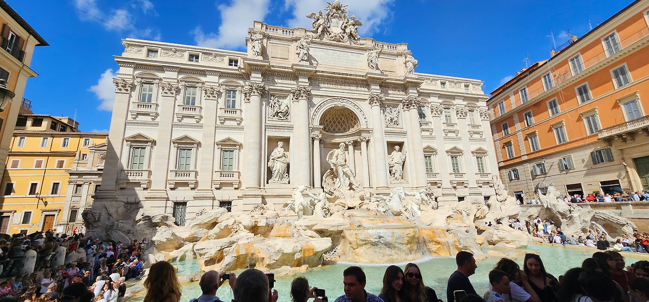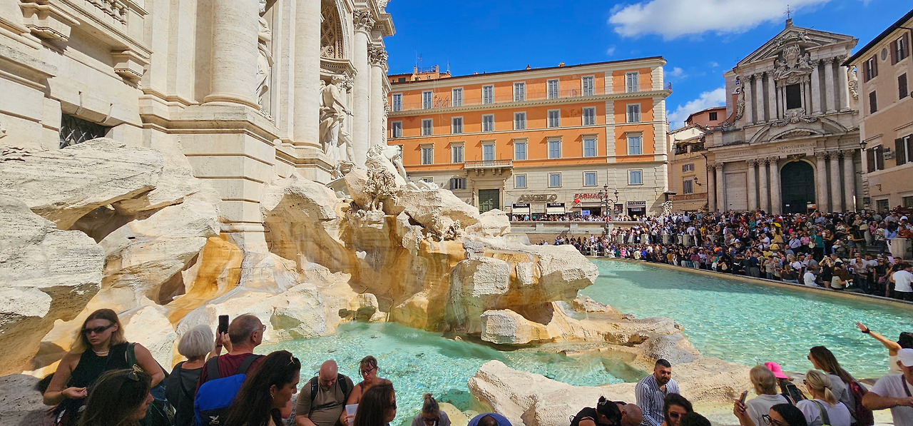 만족스러운 점심을 마치고 곧장 트레비 분수로 향했다. 골목 사이로 걷다가 모퉁이를 돌자 갑자기 시야가 터지며 거대한 바로크 조각이 눈앞에 펼쳐졌다. 익숙한 풍경이 반가웠지만, 분수를 빽빽이 둘러싼 인파를 보는 순간 가장 먼저 떠오른 것은 소매치기에 대한 경계심이었다. 세계적인 명소 앞에서 감탄보다 소지품 걱정이 앞서는 스스로가 우스워 실소가 나왔다.
