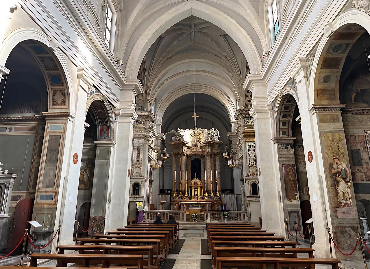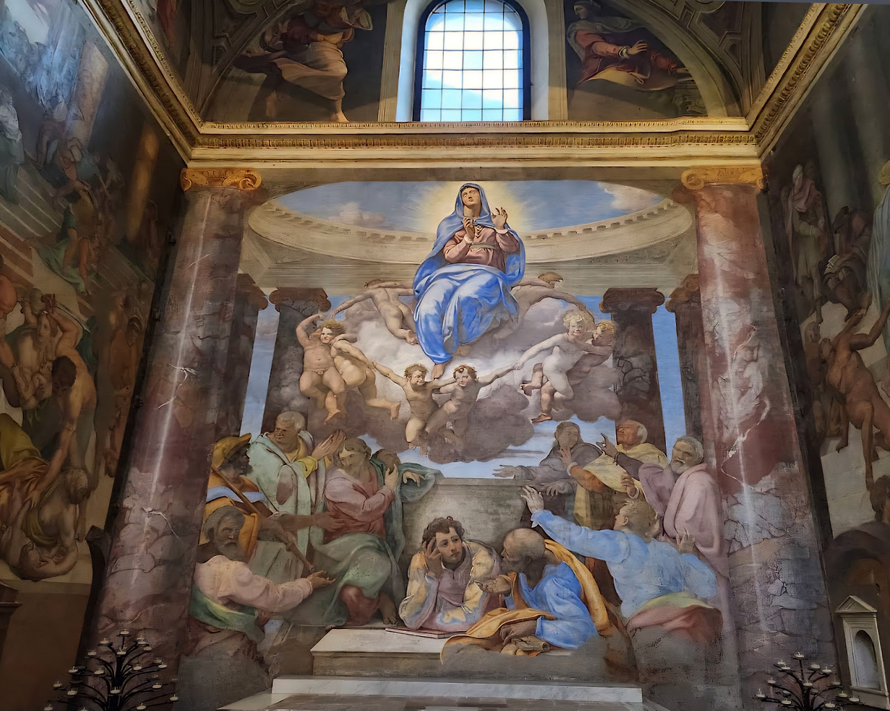 내부 곳곳의 경당을 따라 시선을 옮기면, 16세기 르네상스 후기의 걸작들을 만날 수 있다. 특히 미켈란젤로의 제자였던 다니엘레 다 볼테라와 그의 화파가 남긴 프레스코화들이 인상적이었다. 성화 속 인물들의 표정과 색채는 로마 특유의 격렬함보다는 숙련되고 섬세한 우아함을 담고 있어, 사색적인 분위기를 더했다. 이 그림들은 화려한 제단 장식이라기보다는, 빛과 그림자의 섬세한 대화를 통해 영적인 메시지를 전달하는 듯했다. 높고 시원하게 뻗은 천장과 기둥들은 시선을 위로 끌어올리며, 마치 하늘과 가까운 이 위치의 특성을 시각적으로 표현하는 듯했다.