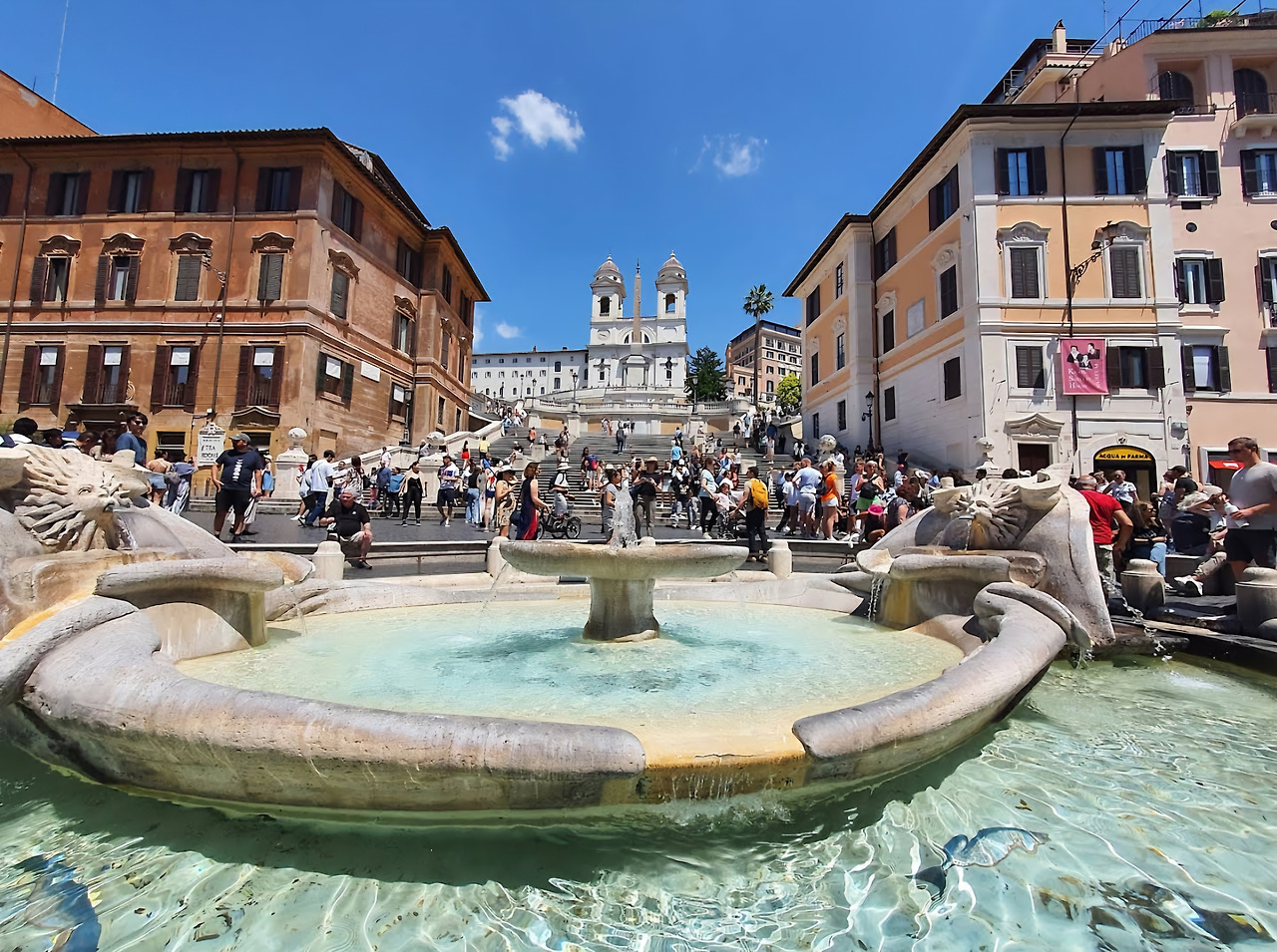 콘도티 거리의 명품숍 사이를 비집고 걸어 나오자 시야가 탁 트이며 스페인 광장이 펼쳐졌다. 한때 인근 스페인 대사관에서 이름을 얻은 이 광장은 계단과 분수, 주변 건축이 어우러진 풍경 덕분에 이제 로마를 대표하는 장면처럼 자리 잡았다.