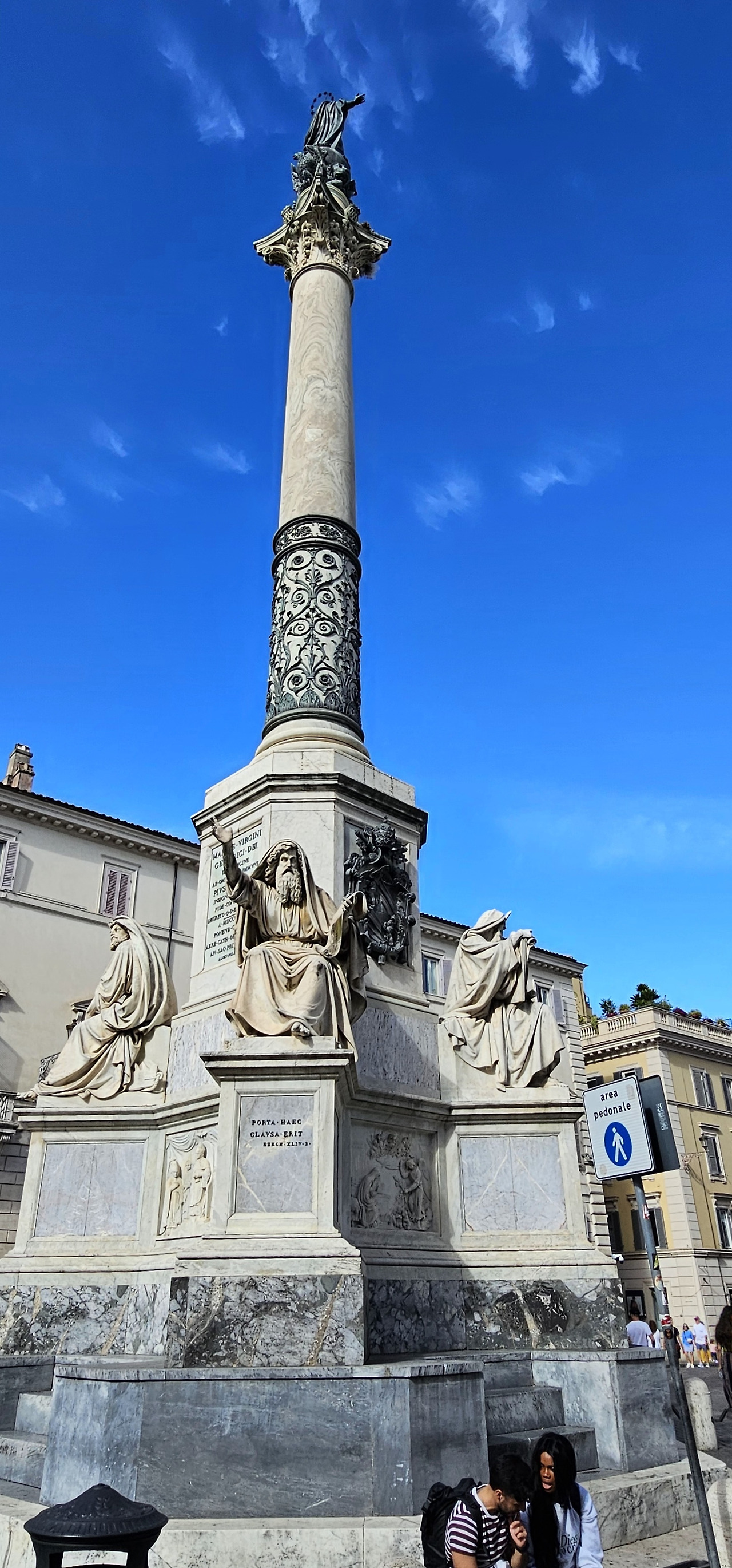 고대 로마의 전승 기념탑을 연상시키는 웅장한 기둥 위에는, 순백의 성모 마리아 동상이 하늘을 향해 팔을 펼치고 있었다. 로마의 푸른 하늘을 배경으로, 도시의 모든 번잡함을 초월한 듯한 성모님의 모습은 깊은 위로와 함께 숭고한 아름다움을 선사했다. 기단에 새겨진 부조와 청동상들 역시 원주가 가진 역사적, 종교적 무게를 묵묵히 증명하고 있었다.