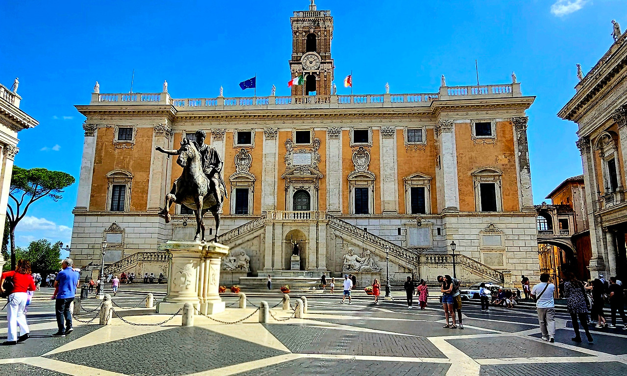 광장 중앙의 마르쿠스 아우렐리우스 기마상 복제본도 눈길을 끈다. 세심하게 계산된 비율로 제작된 이 조각은 같은 높이에서 바라보면 어딘가 균형이 맞지 않는 것처럼 보이지만, 실제로는 받침대 아래에서 올려다볼 때를 기준으로 비례를 맞춘 덕분에 말과 기수가 막 움직이려는 순간을 포착한 듯한 생동감을 준다. 조각이 아니라 당장이라도 돌기둥 사이를 걸어 나올 것만 같은 착각이 들 정도다. 중세 내내 이 동상이 살아남을 수 있었던 이유는 사람들이 이것을 기독교를 공인한 콘스탄티누스 황제의 상으로 착각했기 때문이라는 이야기도 전해진다. 역사의 아이러니가 예술을 지켜낸 셈이다.