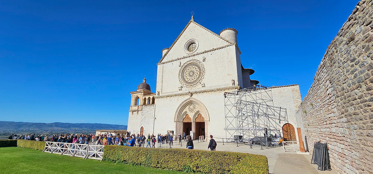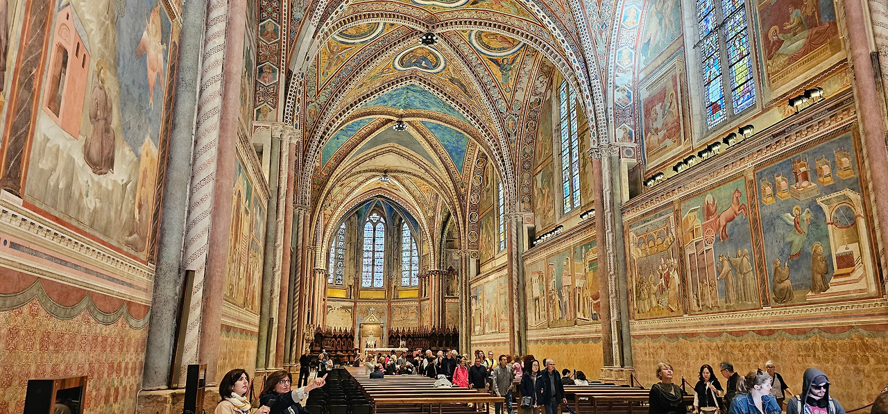 아침 식사를 끝내고 체크아웃을 위해 캐리어를 꾸려 호텔 로비에 맡겨 놓고, 본격적으로 프란체스코 대성당과 아시시 마을을 구경하러 나섰다. 프란체스코 대성당 아래 광장에서 단체 사진을 찍은 후, 드디어 상부 성당으로 올라갔다. 마침 일요일 미사가 진행 중이라 성당 내부로 들어가는 것은 물론, 안쪽까지 다가가 조토의 프레스코화를 온전히 감상할 수 없어 아쉬움이 컸다. 그러던 중, 다음 미사가 시작되기 전까지 약 10분간의 짧은 공백이 생겼고, 그 순간을 놓치지 않고 재빨리 입장했다. 앞쪽으로 이동하며 프레스코화를 비록 서둘러 보아야 했지만, 거의 다 감상할 수 있어 다행이었다. 가톨릭 신자라면 이곳에서 미사에 직접 참석하는 것이야말로 여행에서 누릴 수 있는 최고의 경험이 될 것이다.