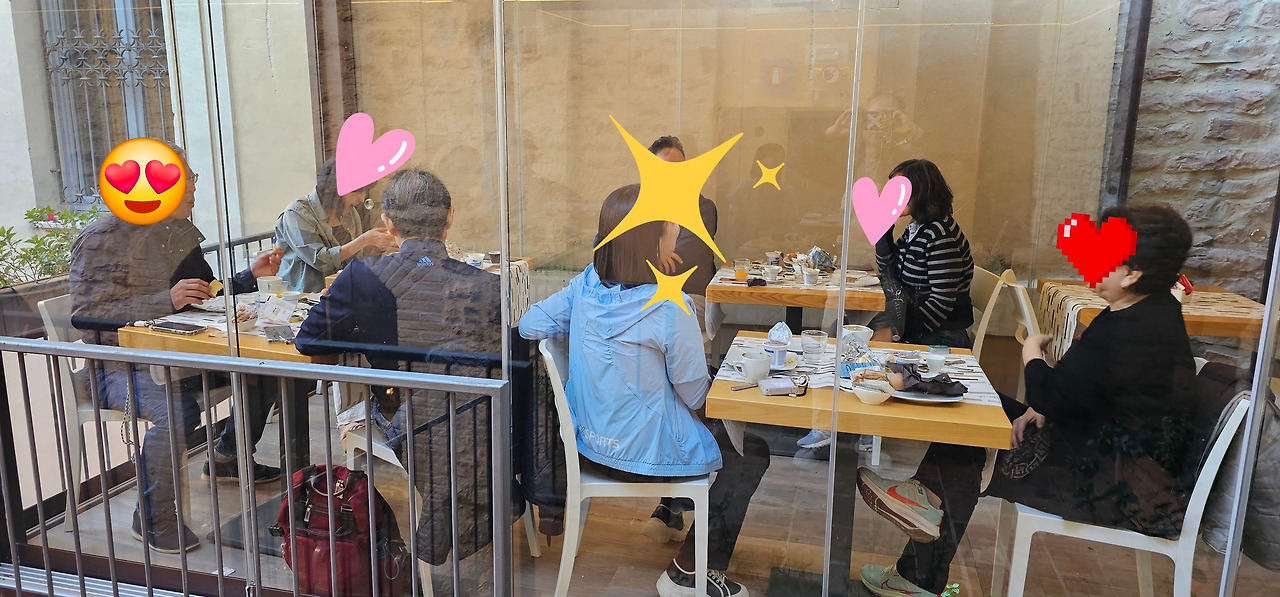 일행들은 안도감과 함께 살짝 들뜬 기분이었고, 호텔 식당의 세련된 분위기와 쾌적함 덕분에 더욱 만족스러운 아침 식사 시간을 보낼 수 있었다. 과일, 다양한 종류의 빵과 잼, 달걀 요리, 맛있는 커피까지 아침 식사로서 충분한 구성을 갖추었고, 하나같이 정갈하고 맛도 좋았다. 무엇보다 우리가 거의 독방처럼 사용한 공간은 통유리창을 통해 호텔 입구를 내려다볼 수 있어 개방감도 뛰어나 더욱 만족스러웠다.