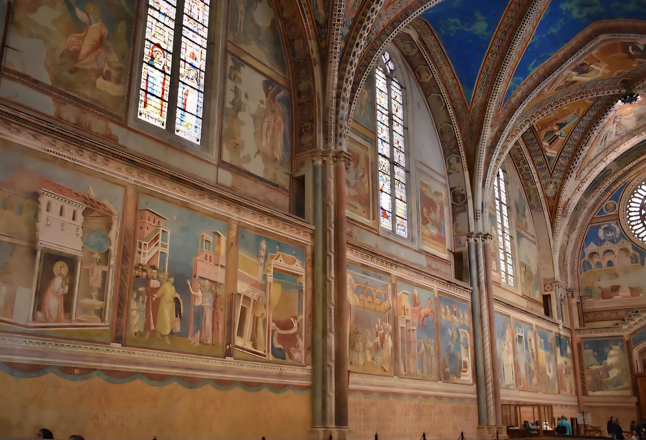 1228년에 공사를 시작한 성당 지하에는 프란체스코 성인의 유해가 안치되어 있다. 상부 성당과 하부 성당으로 구성된 이 성당은 후기 중세 화가들의 프레스코화로 장식되어 있는데, 여기에 참여한 대표적인 화가가 치마부에와 그의 제자인 조토다. 성 프란체스코의 생애를 28개의 연작으로 묘사한 조토의 프레스코화는 이탈리아 최고의 프레스코화로 손꼽힌다.