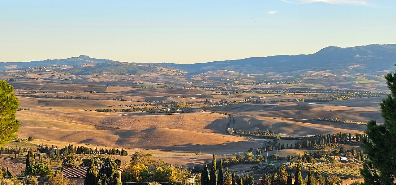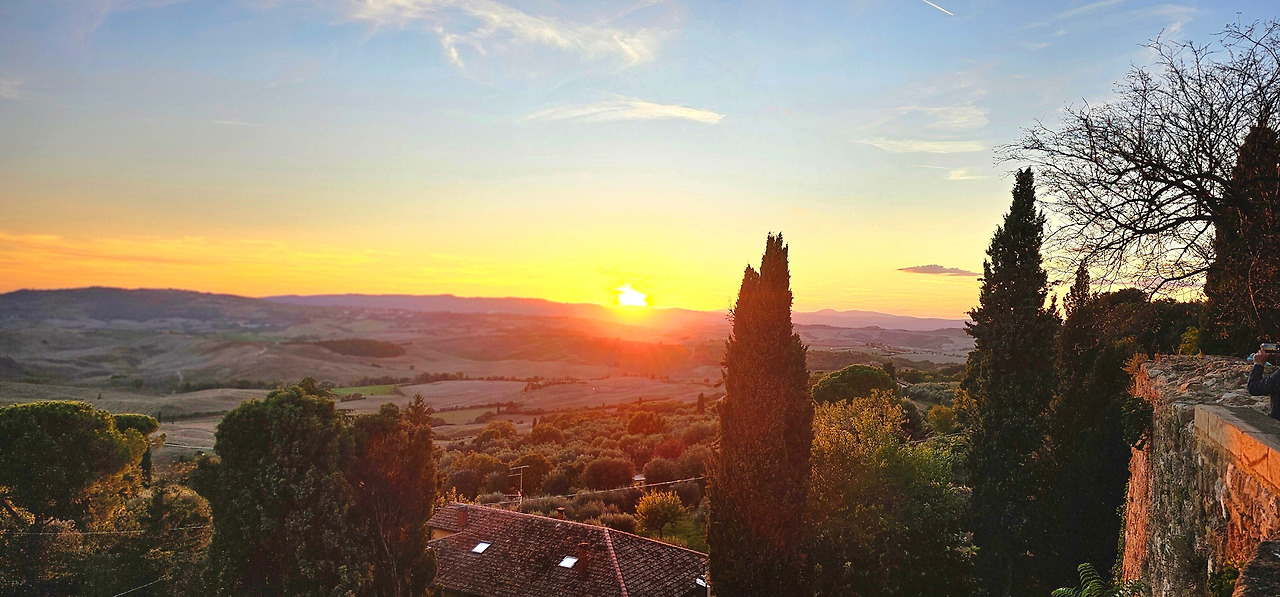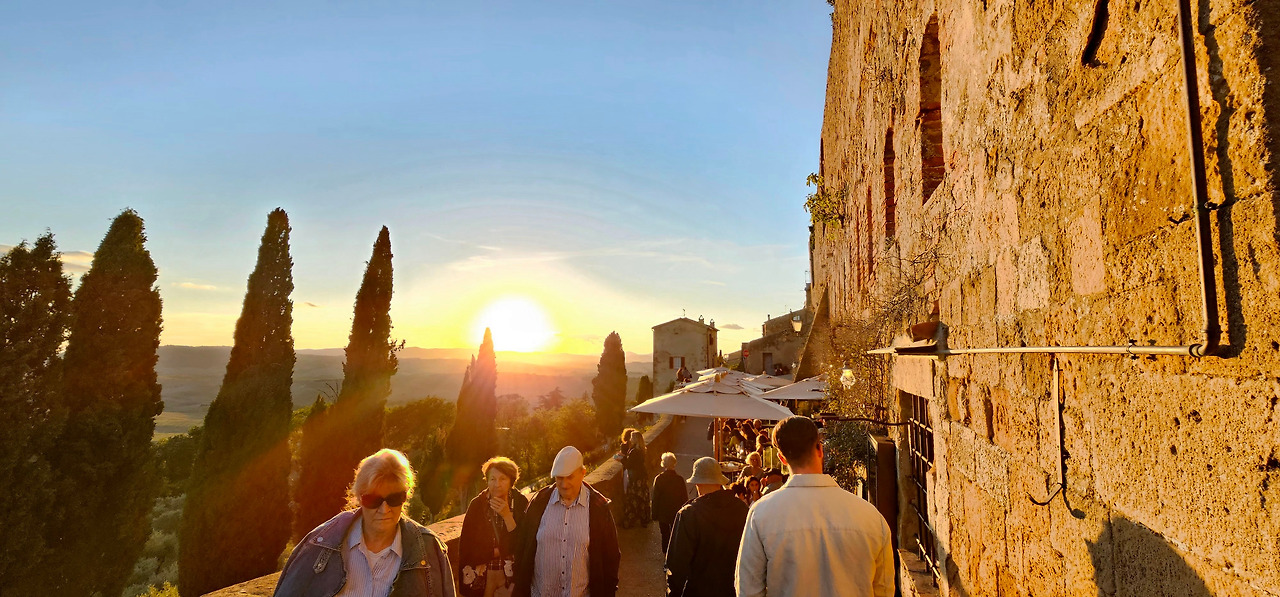 아름다운 골목길을 따라 걷다 보니, 피엔차 언덕의 풍경이 살짝살짝 모습을 드러냈다. 그리고 마침내 토스카나의 끝없이 펼쳐진 구릉지대가 한눈에 들어왔다. 황금빛으로 물들어 가는 들판과 부드러운 능선들이 파노라마처럼 펼쳐졌다. 눈앞의 광경에 감탄이 절로 나왔다.