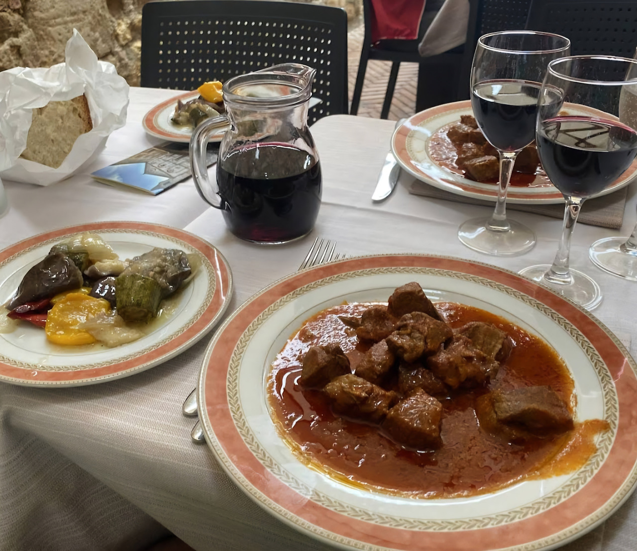 식당은 아늑하고 편안한 분위기였다. 우리는 파스타와 피엔차의 대표 요리인 멧돼지 요리를 와인과 함께 주문했다. 그런데 이탈리아 식당답지 않게 음식이 예상보다 빨리 나왔다. 파스타 면이 살짝 퍼져 있어서, 지금까지 먹었던 이탈리아 파스타와는 식감이 달라 다소 아쉬웠다.