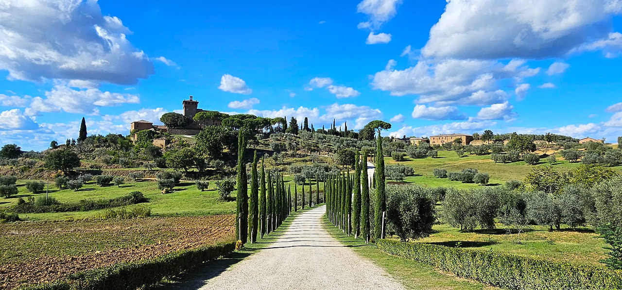 아시시를 뒤로하고, 이제 토스카나의 심장부, 발도르차 평원을 향해 달렸다. 유네스코 세계문화유산으로 지정된 이 평원은 완만한 언덕과 광활한 초원으로 유명하다. 우리가 방문한 9월 말은 봄철의 싱그러운 초록빛을 경험하기엔 늦은 시기였지만, 언덕 위로 줄지어 선 키 큰 사이프러스 나무들이 만들어내는 풍경은 충분히 그림 같았다.