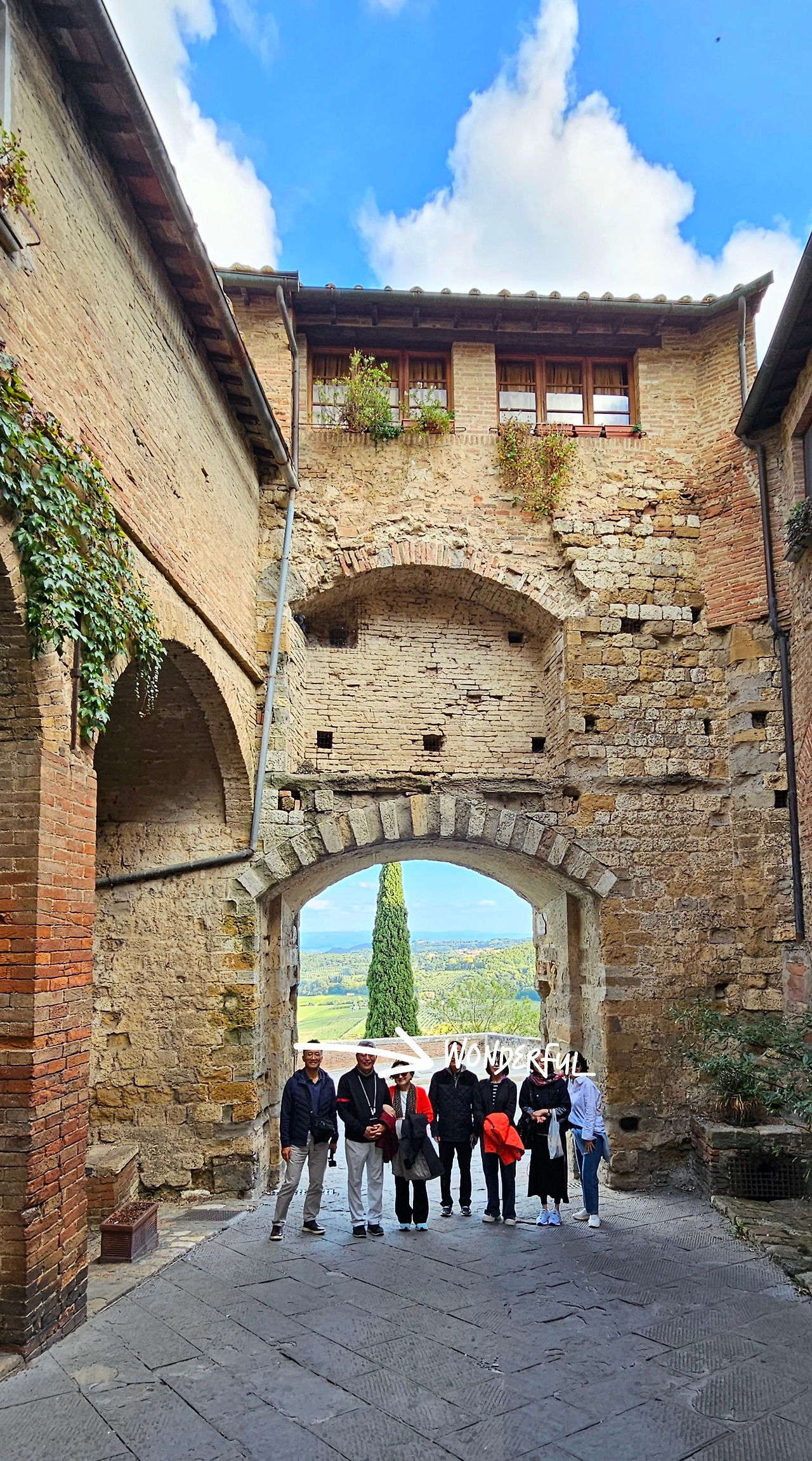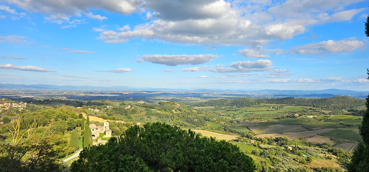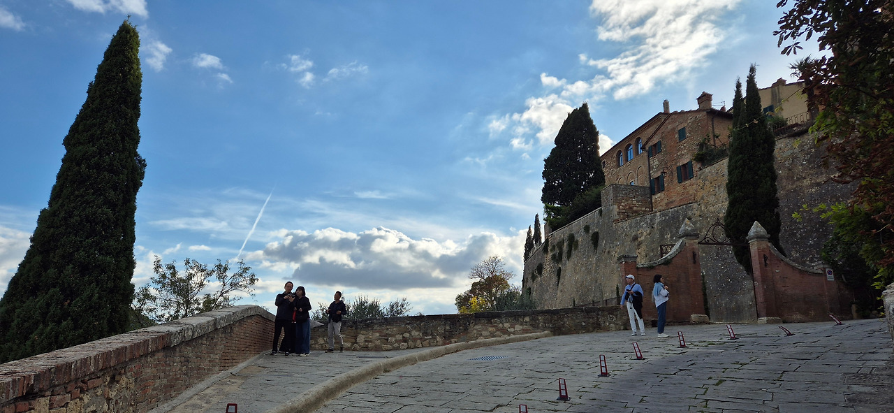 거리에는 개성 넘치는 선물가게와 매력적인 식당들이 줄지어 늘어서 있었고, 골목마다 운치가 가득했다. 자연스럽게 휴대폰을 꺼내 사진을 찍고 싶은 충동이 일었다. 전망 포인트에 도착하니 비록 일망무제(一望無際)라고는 할 수 없지만, 탁 트인 시야 속으로 토스카나의 평원이 시원스럽게 펼쳐졌다. 곳곳에 불쑥불쑥 솟아 있는 사이프러스 군락들은 "여기가 바로 토스카나다!"라고 외치는 듯했다. 성문과 언덕길이 어우러진 풍경 속에서 중세의 정취가 한층 더 짙게 느껴졌다.